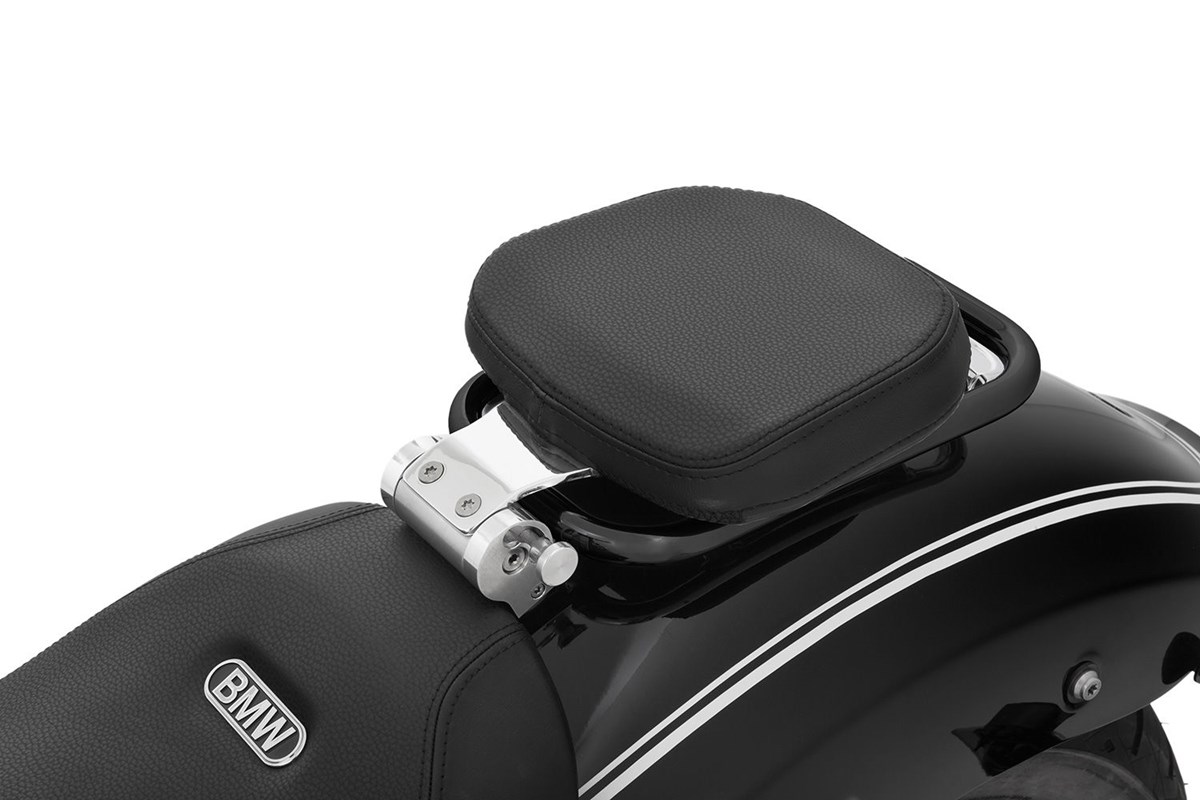 Zusätzlich bieten wir eine klappbare Fahrerrückenstütze an, die sich, nach hinten geklappt, im Handumdrehen zum Soziussitz wandelt und sich dabei formschlüssig auf dem Gepäckträger abstützt. In beiden Positionen wird sie mit einem Bolzen zuverlässig arretiert. Voraussetzung für die Montage der Fahrerrückenlehne ist der Gepäckträger. Die Verschraubung erfolgt mit diesem zusammen am vorderen Montagepunkt des serienmäßigen Soziussitzes.