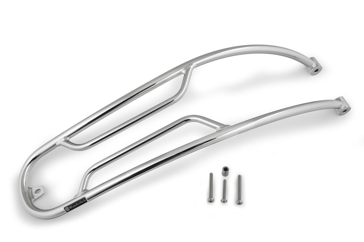 Diese Tankreling setzt dem Tank im wahrsten Sinne des Wortes die Krone auf. Schon der serienmäßige, tiefschwarze Tank der R 18 wirkt im Zusammenspiel mit dem Chrom des Tankverschlusses, der Tankblende und dem BMW-Logo sehr edel und klassisch. Unsere Tankreling unterstreicht diese abgestimmte Anmutung gleich dreifach. Mit ihrer stilsicheren, funktionalen Form, den in ihrer jeweiligen Dimension sorgfältig aufeinander abgestimmten Rohren und den hochglänzenden Chromoberflächen, die, im Kontrast zum glänzend schwarzen Tank, besonders zur Geltung kommen. Dabei folgt die Form der Tankreling mit geringer Distanz zum Tank akkurat dessen Krümmungsverlauf und bindet optisch gekonnt den Tankverschluss und die sattelseitige verchromte Tankblende mit ein.