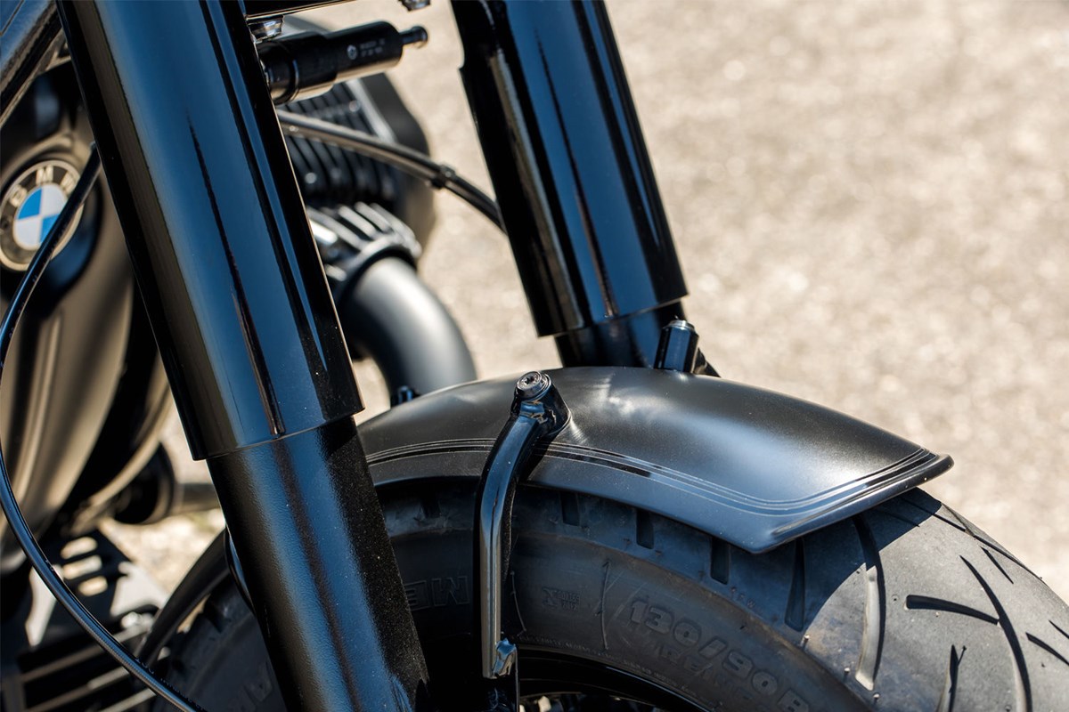 Der charakteristische Halter für den Vorderradkotflügel ist aus stabilem, hochwertigem Präzisions-Rohrstahl mit 16 mm Durchmesser gefertigt und in drei Schichten schwarz-glänzend. Er wird zusammen mit dem Fender an den vier serienmäßigen Befestigungspunkten sicher verschraubt.