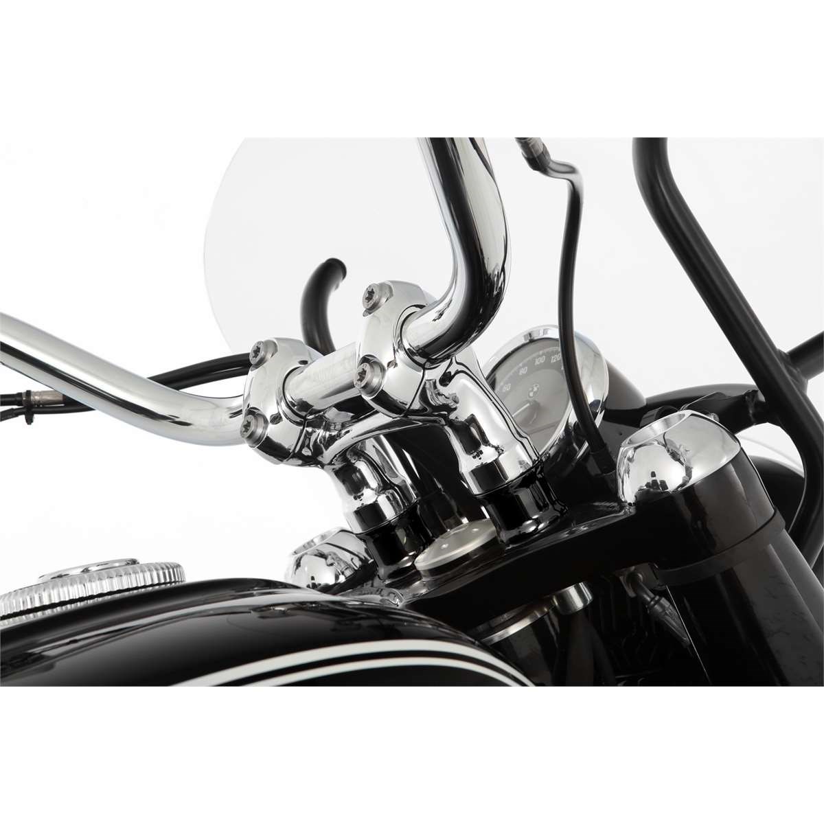 Das Design unserer Lenkererhöhung, die wir aus Aluminium fertigen, fügt sich harmonisch im Bereich der oberen Gabelbrücke ein. Zum Blickfang wird sie durch das feine Finish der hochwertigen Verchromung.