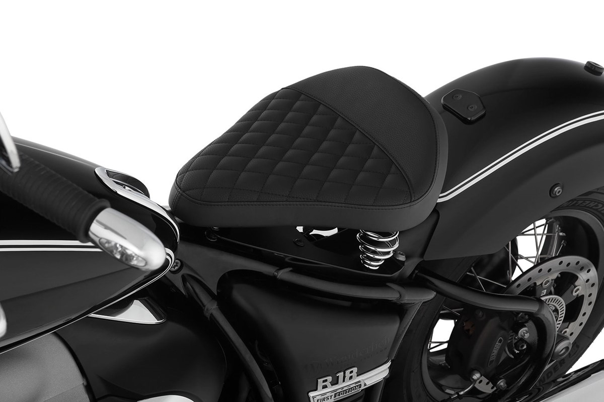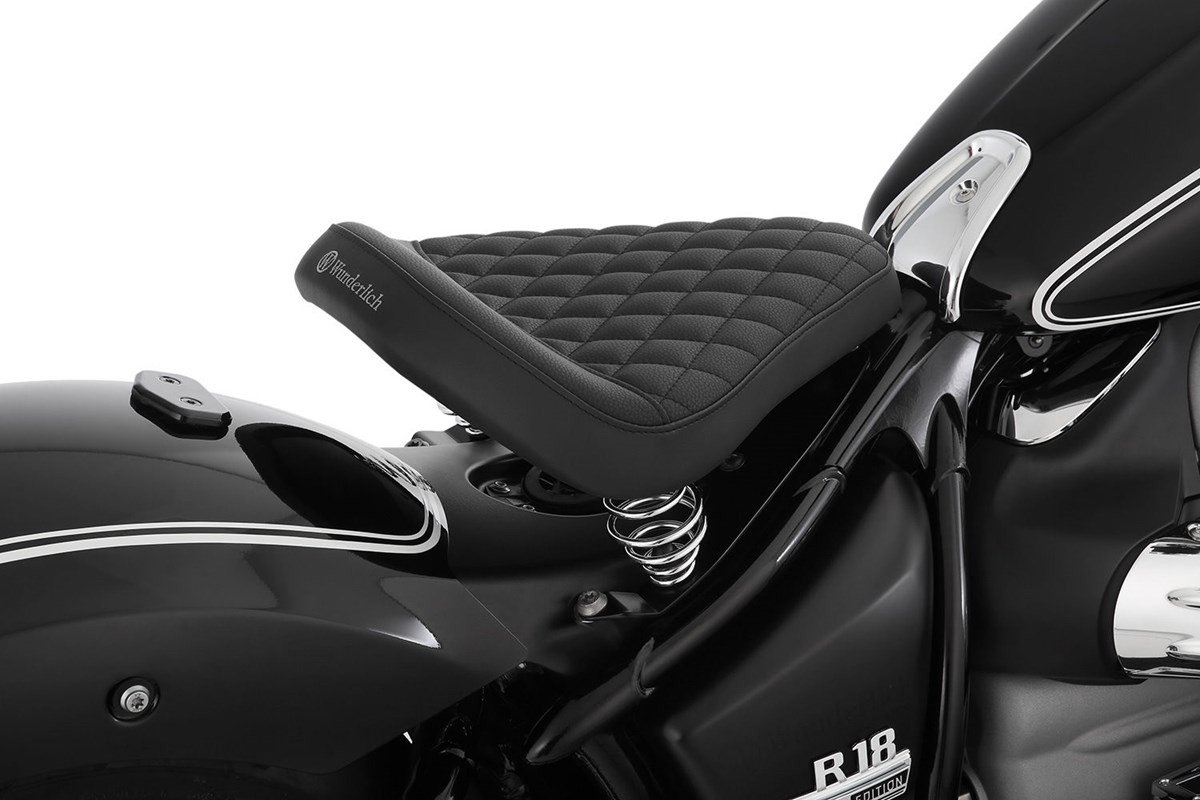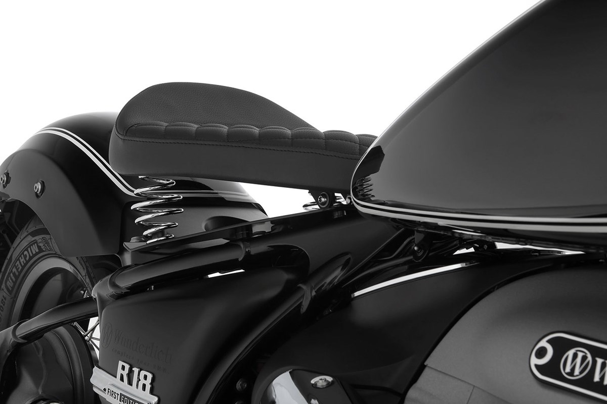 Exklusiv und Old School: Einzigartiger, mit Echtleder bezogener Schwingsattel im »RockBob«-Stil, passend zum BMW R 18-Serienheck.
