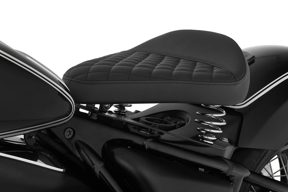 Ein zentrales und prägendes Detail unseres »RockBob«-Konzepts sind dessen Materialität und die Textur der Oberflächen sowie deren Haptik. Dieser Ansatz wird an einer Stelle unmittelbar erleb- und sichtbar, an der der Fahrer mit dem Bobber Kontakt aufnimmt: Auf dem Schwingsattel. Der in handwerklicher Sattlerarbeit angefertigte, ergonomische Sattel besteht aus exklusivem, hochwertigem Leder. Das angewendete Gerbverfahren unterstützt das Patinieren des Leders. So bildet sich dessen individueller Charakter, der sich erst in Verbindung mit dem Fahrer über die Zeit entwickeln kann, aus. Geziert wird der Old School- Federsattel mit der partiell angebrachten, rautenförmigen Steppung des Bezugs. Die Anmutung dieses Premium-Federsattels rufen unweigerlich die Bilder einer Legende, die BMW R 32, ins Gedächtnis.