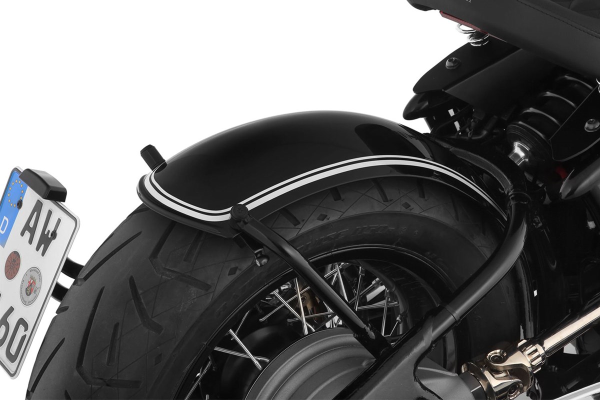 Da bei der Montage des Heckfenders der Originale Kennzeichenträger ohnehin entfällt, empfehlen wir die Verwendung unseres seitlichen Kennzeichenträgers (Art. Nr. 18500-002). Dem Heckfender liegt ein Kabelsatz mit integrierter Elektronik bei, der speziell für die R 18 gefertigt wurde. Dieser verbindet die Kennzeichenbeleuchtung sowie die 3 in 1-Blinker-, Rück- und Bremslicht-Kombination per Plug und Play mit dem Fahrzeug.