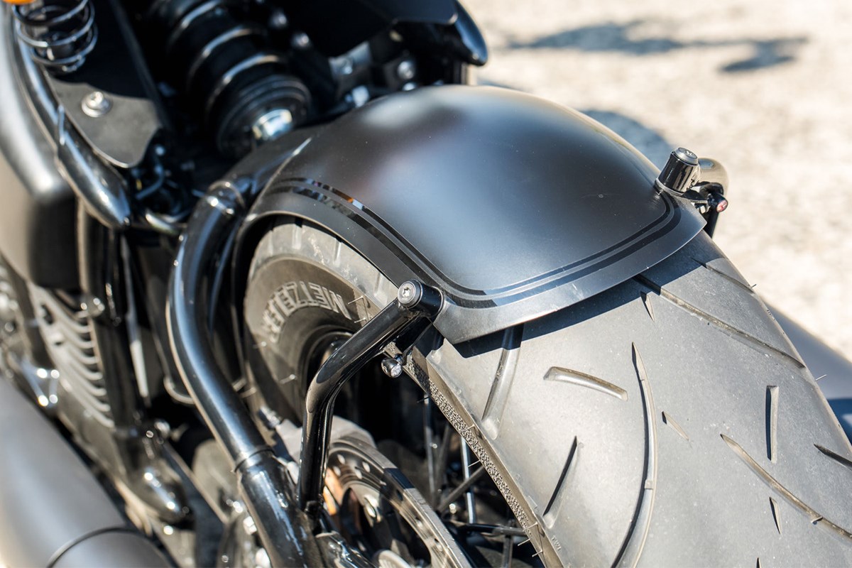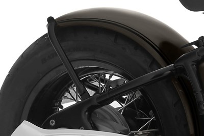 Der charakteristische, hintere Halter für den Hinterradkotflügel ist aus stabilem, hochwertigem Präzisions-Rohrstahl mit 16 mm Durchmesser gefertigt und schwarz pulverbeschichtet. Die Befestigung erfolgt hier jeweils seitlich an der Schwinge. Die vordere Befestigung des Heckfenders wird an den originalen Befestigungspunkten des dafür weichenden Innenkotflügels vorgenommen (4-Punkt Befestigung).