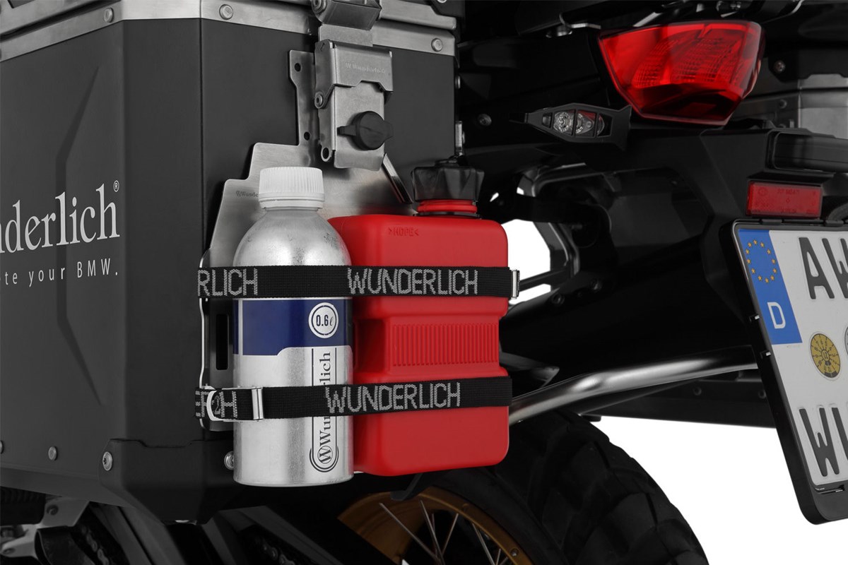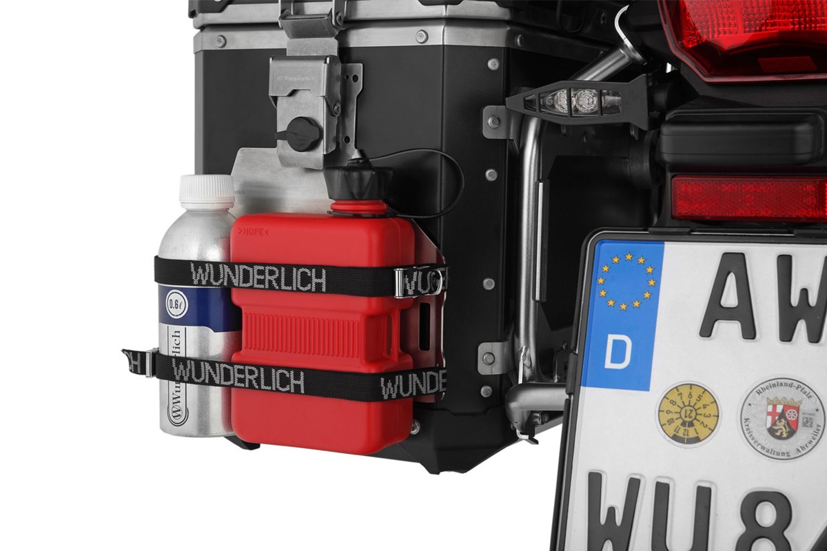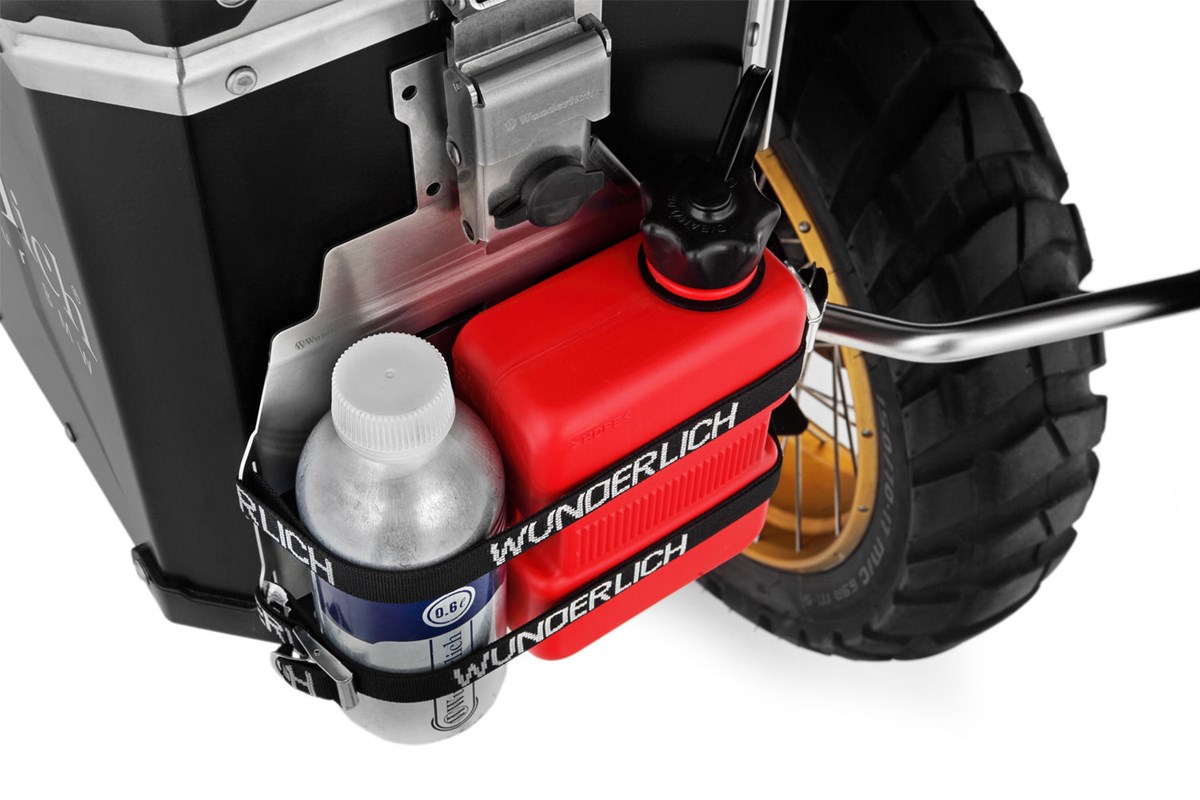 Unser Koffer Rack ist die perfekte Ergänzung für den linken Koffer und alles, was entweder schnell griffbereit sein soll oder im Koffer nichts zu suchen hat. Es nimmt die gängigen Reisekanister für Benzin, Ölflaschen genauso auf, wie kompakte Vorratskanister für Wasser oder sonstige Reiseutensilien. Wer kennt nicht die ärgerlichen Umstände, wenn Flüssigkeiten auslaufen – gerade unterwegs. Und das freiwerdende Koffervolumen kann man sicher für besseres nutzen. Das solide aus Edelstahl gefertigte Rack ist praktischerweise so ausgelegt, dass es zwei unserer Aluminiumflaschen (Art. Nr. 43583-000) nebeneinander aufnimmt. So lassen sich z.B. Öl und Benzin komfortabel getrennt mitführen. Die Sicherung erfolgt mittels Gurtbändern und den im Rack integrierten Zurröffnungen. Unsere praktischen Gurtbänder (Art. Nr. 25120-012 - bitte extra bestellen) eignen sich perfekt zum Befestigen aller möglichen Gegenstände am Rack.