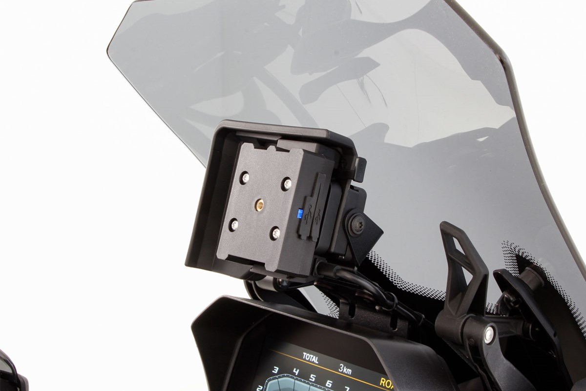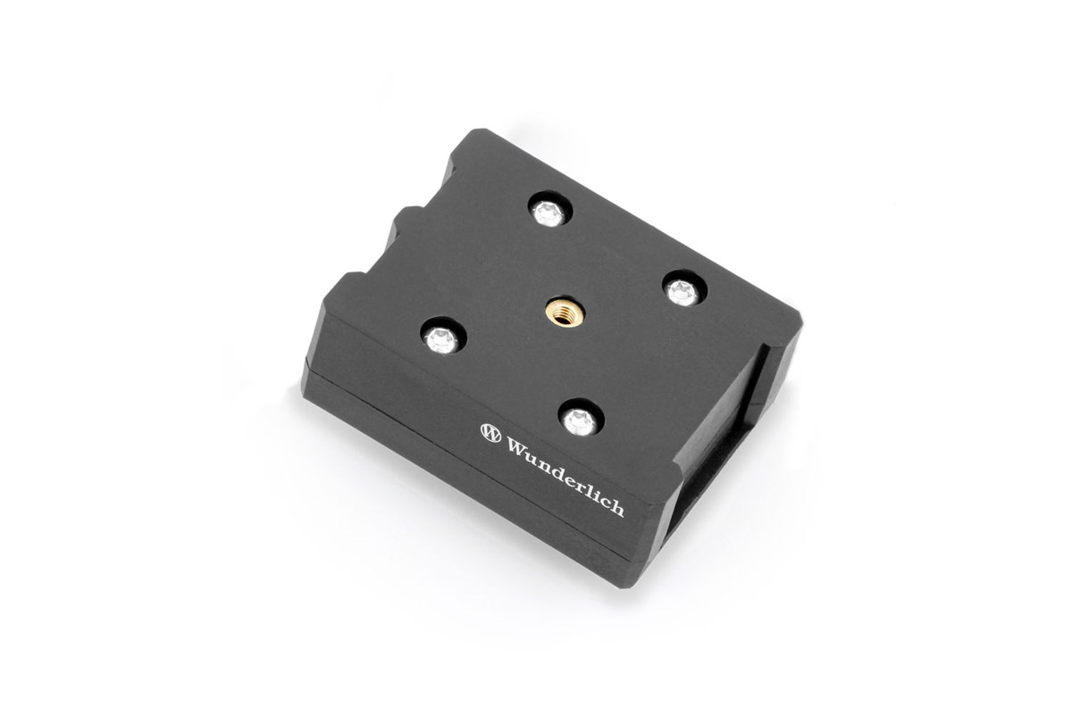 Das zentral angeordnete Schraubgewinde dient als Vorbereitung zur Aufnahme unseres MultiClamp- oder des SP-Connect Adapters. Eingeschraubt können diese zur Aufnahme des MultiClamp Smartphone-Halters (45155-102) oder der modellspezifischen SP-Connect Smartphonehülle (45150-xxx) genutzt werden.