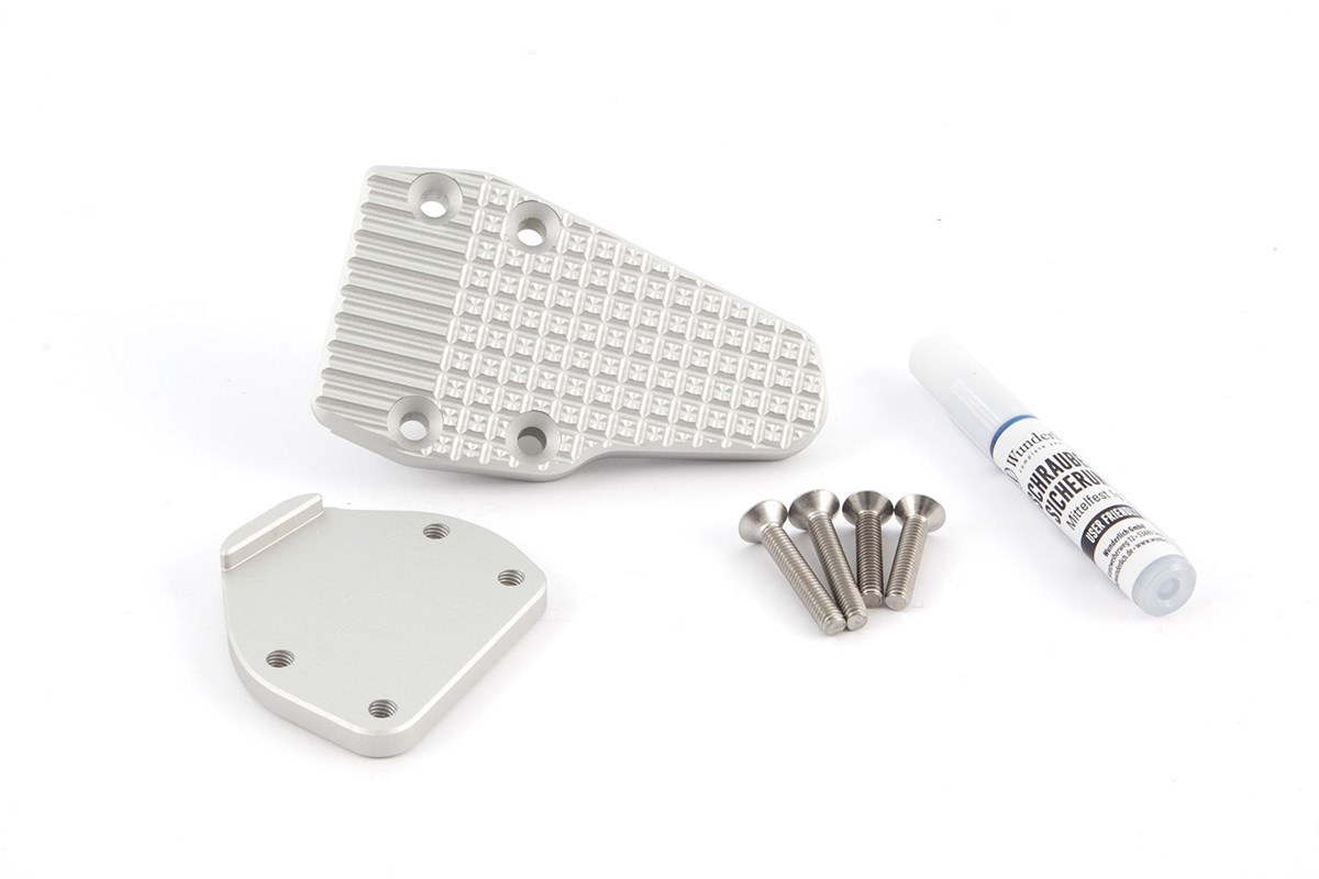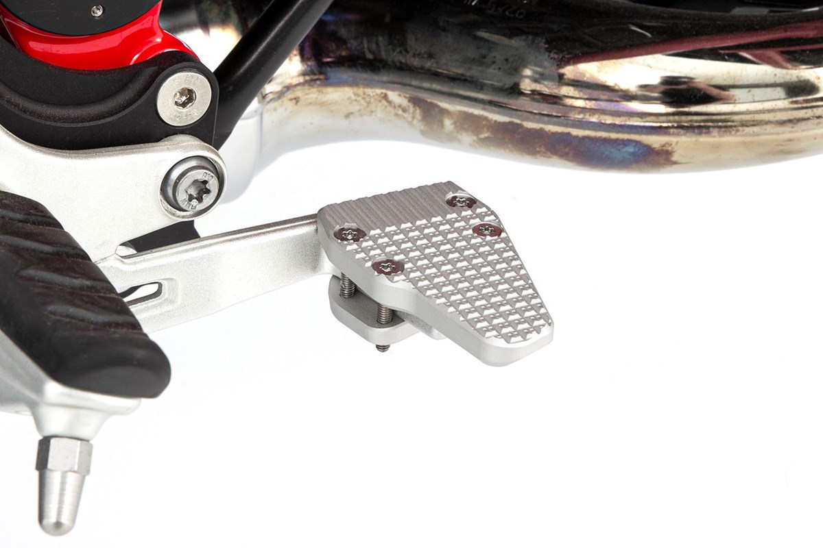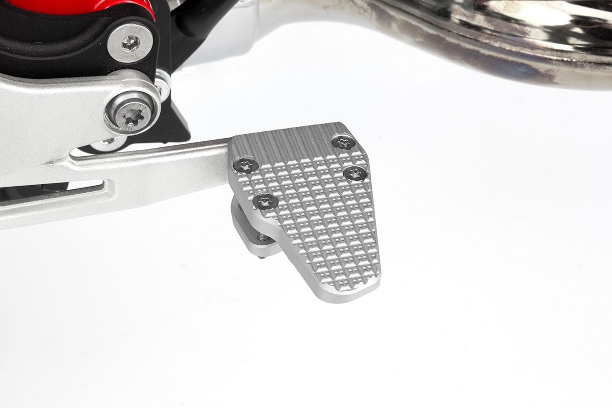 Im Original ist die Fußauflagefläche des Bremshebels leider etwas klein geraten und stellt nicht selten ein Sicherheitsrisiko dar. Diese Fußbremshebel Vergrösserung dient als Ergänzung des originalen Fußbremshebels. Sie wird einfach auf den Hebel aufgeschraubt. Versehentliches Abrutschen oder das Verfehlen des Hebels und der damit verbundene „Tritt ins Leere“ wird damit fast unmöglich. Die aufwändig gefräste Riffelung sorgt für Rutschsicherheit bei Nässe. Die Auflagenvergrößerung verbessert Ergonomie und Komfort und erhöht damit die passive Sicherheit.