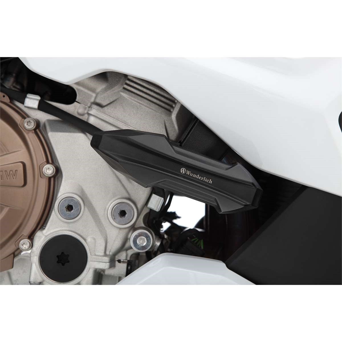 Unsere Schutzpads RACING haben wir ursprünglich für den Rennsport-Einsatz entwickelt und bei Wunderlich MOTORSPORT eingesetzt. Sie werden mit soliden Befestigungen am Rahmen rechts und links montiert. Linksseitig setzen wir dazu eine verdrehsichere 2-Punkt Halterung ein. Für die rechte Seite haben wir einen aufwändigen, konturgenau gefrästen Adapter konstruiert, mit der das Schutzpad formschlüssig montiert wird.
