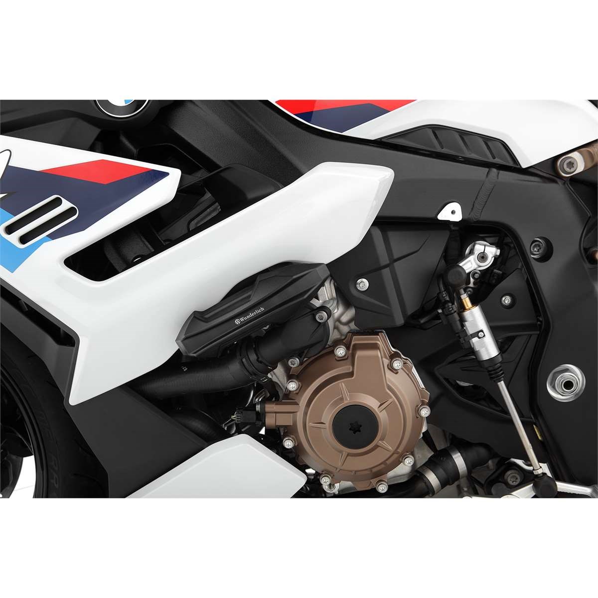 Der Hochleistungsmotor weist eine hervorragende Relation zwischen Leistung und Gewicht auf. Das heißt im Umkehrschluss, dass der Motor im Verhältnis zu seiner Leistung sehr leicht und filigran ausgeführt ist, und bei einem Sturz wenig Substanz entgegenzusetzen hat. Wird das Motorgehäuse beschädigt, ist an eine Weiterfahrt meist nicht mehr zu denken. Deshalb bieten die Form, der Werkstoff und die Konstruktion unserer RACING Pads optimalen Schutz für die Flanken des Motorrads, besonders für Motor und Kupplung sowie die exponierten Aggregate Wasserpumpe und Lichtmaschine.