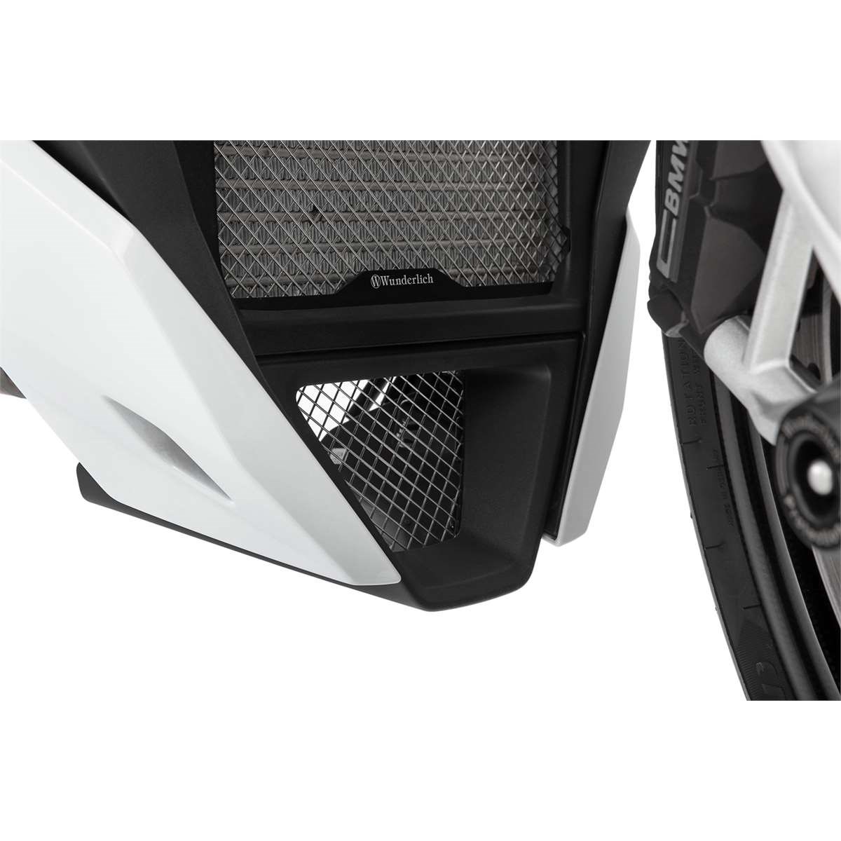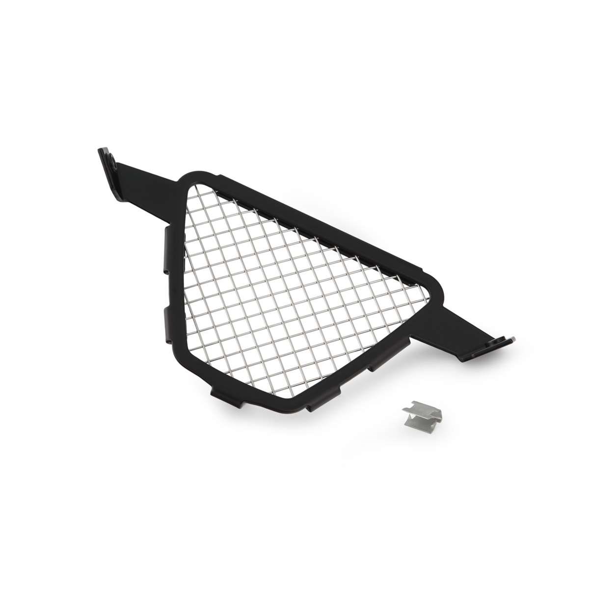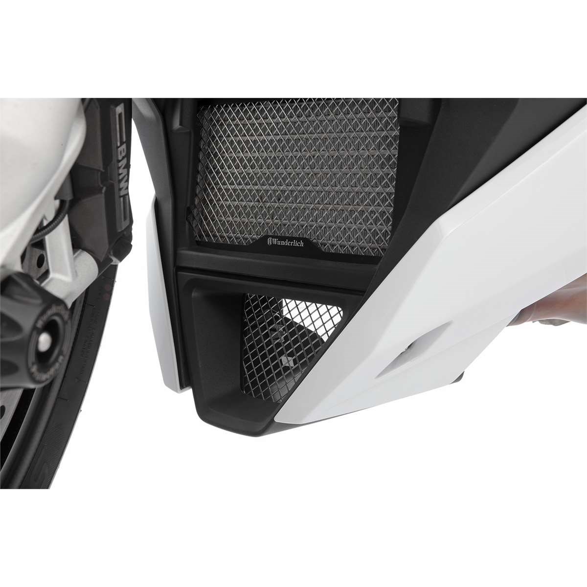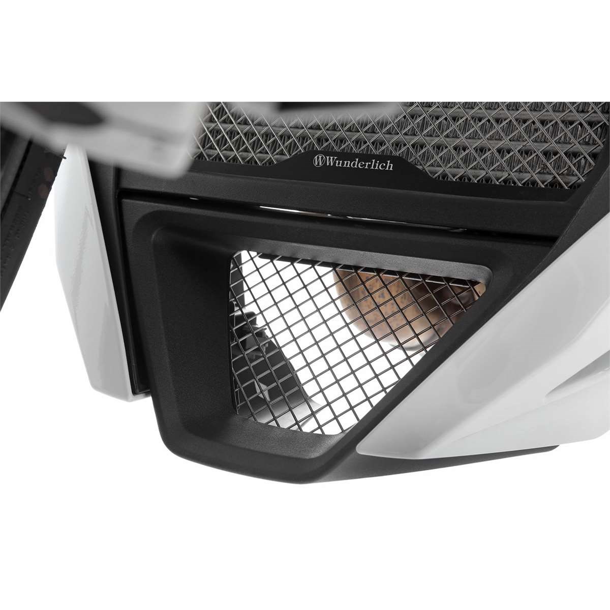 Das Schutzgitter verschließt die wenig ansehnliche Öffnung des Bugspoilers unterhalb des Ölkühlers, die sich unmittelbar hinter dem Vorderrad im Schleuderbereich für aufgewirbelten Straßenschmutz und Steine befindet. Unser Schutzgitter fängt die gröberen Fremdkörper auf und hält sie von Krümmer und Motor fern. Somit werden äußerliche mechanische Beschädigungen und grobe Verschmutzungen am Motor nahezu unterbunden, ohne dass der Kühlstrom des Fahrtwinds reduziert wird. Das widerstandsfähige Schutzgitter besteht aus Edelstahl und ist an den Kreuzungspunkten verschweißt. Der stabile, schwarz eloxierte Alurahmen füllt die Öffnung mit seinem integrierten, sportlichen Design perfekt aus.