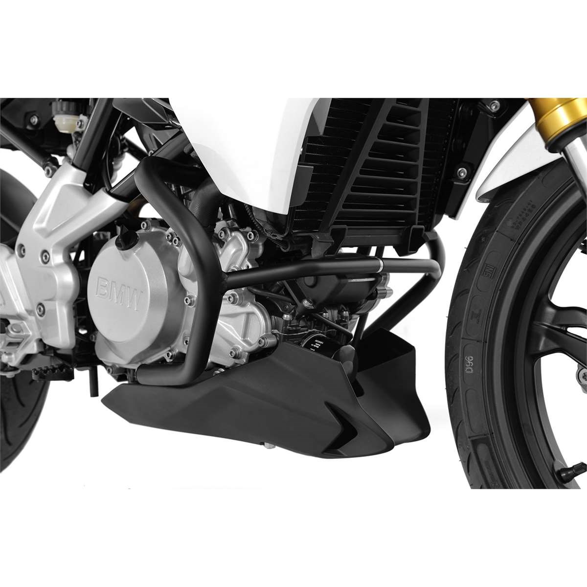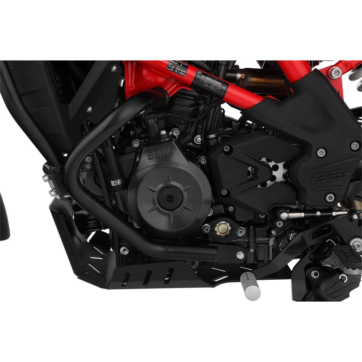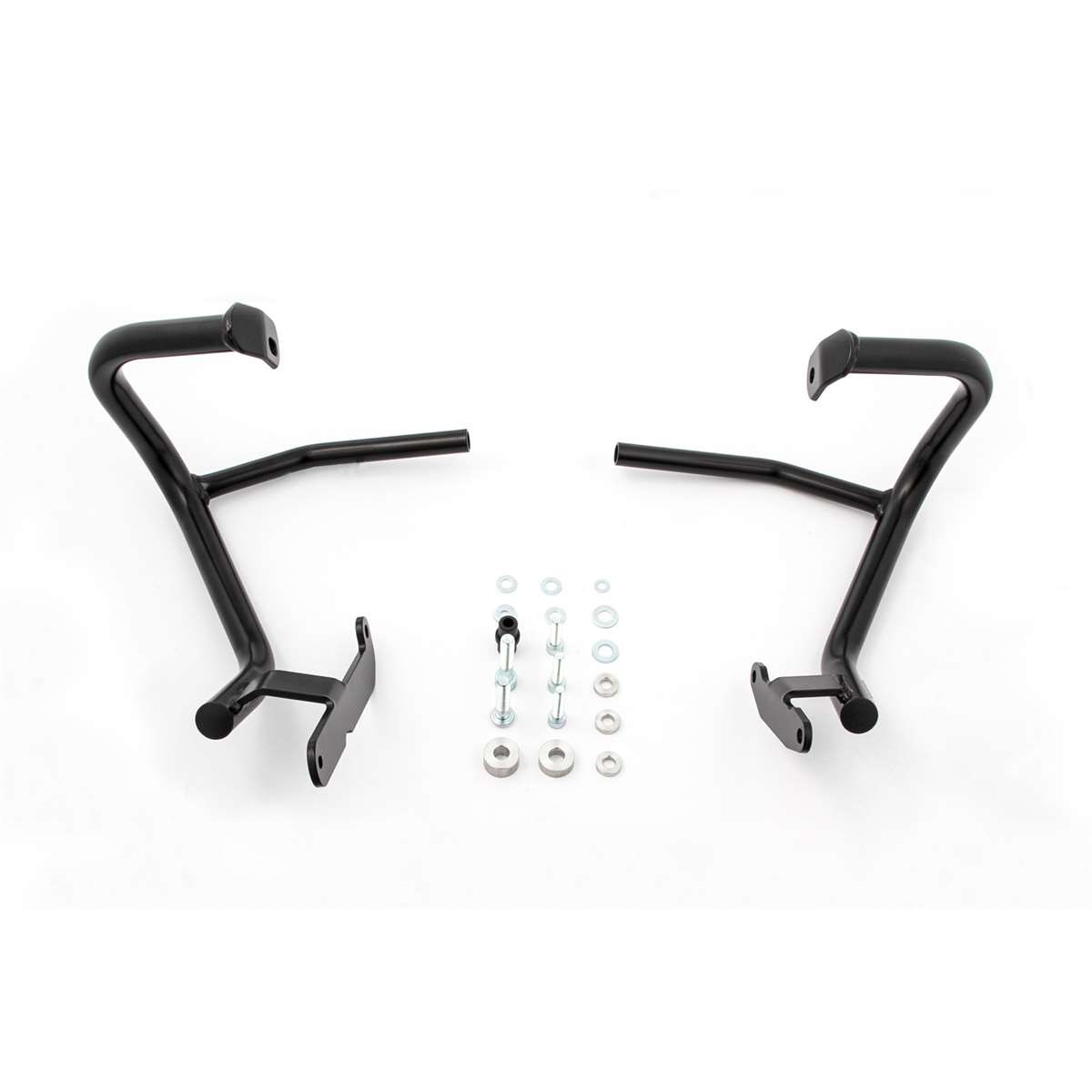 Unser sportliches Motorschutzbügelkonzept verbindet maximale Schutzwirkung mit geringem Gewicht. Durch dessen Bauteilgeometrie sind der Motor, insbesondere die Wasserpumpe, die Kupplung und Lichtmaschine sowie deren Gehäuseabdeckungen optimal und zuverlässig geschützt. Neben dem umfassenden Schutzeffekt haben wir Boden- und Schräglagenfreiheit im Rahmen der Entwicklung und Konstruktion größte Bedeutung beigemessen. So schmiegt sich der zweiteilige Motorschutzbügel eng an und gewinnt durch seine kompakte Bauweise zusätzlich an Stabilität und Steifigkeit – und dies, bei gleichzeitig minimiertem Bauteilgewicht. Die Bügel für die rechte und die linke Seite werden jeweils an drei ausgewählten Aufnahmepunkten verschraubt. Die bei einem Sturz oder Umfaller auftretende Momente und Kräfte werden damit auf je drei Punkte pro Fahrzeugseite verteilt. Das reduziert die Belastungsspitzen. Die Montage ist leicht zu bewerkstelligen und bei Wartungsarbeiten braucht er nicht demontiert zu werden.
