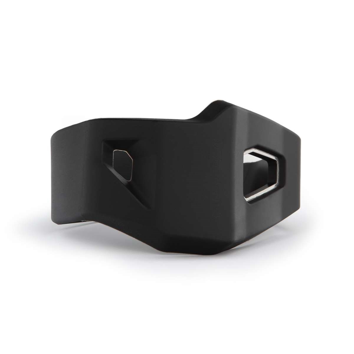 Der Protektor ist ausgesprochen leicht zu montieren. Er besteht aus hitzebeständigem Silikon-Elastomer, das mit einer Edelstahleinlage zusätzlich stabilisiert wird. Damit lässt er sich ohne Werkzeug einfach – wie eine Banderole- von hinten über die Endschalldämpferkappe „aufziehen“ und exakt positionieren.