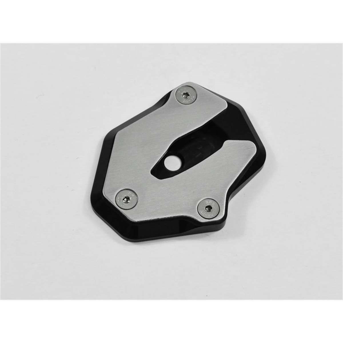 Der Seitenständerfuß vergrössert die Auflagefläche des Seitenständers und verbessert die Standfestigkeit auf unbefestigtem und weichem Untergrund. Er wird aus hochfesten Aluminium CNC-gefräst und schwarz eloxiert. Das Spannblech sowie die Schrauben sind aus Edelstahl, somit bietet dieser Seitenständerfuß eine lange Lebensdauer, sowohl optisch als auch funktional.