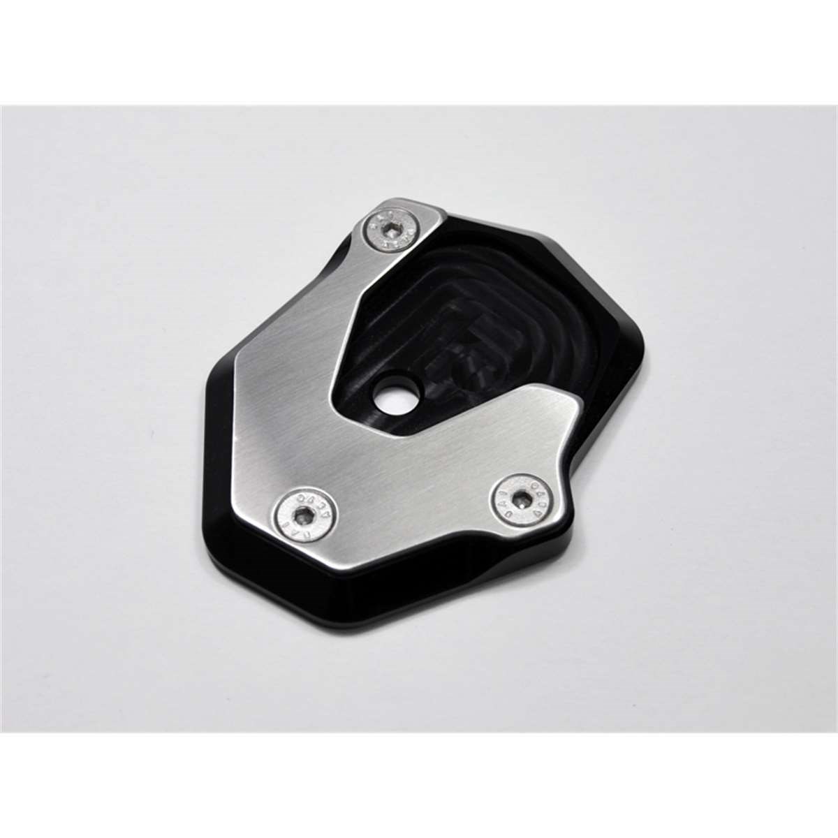 Der Seitenständerfuß vergrössert die Auflagefläche des Seitenständers und verbessert die Standfestigkeit auf unbefestigtem und weichem Untergrund. Er wird aus hochfesten Aluminium CNC-gefräst und schwarz eloxiert. Das Spannblech sowie die Schrauben sind aus Edelstahl, somit bietet dieser Seitenständerfuß eine lange Lebensdauer, sowohl optisch als auch funktional.