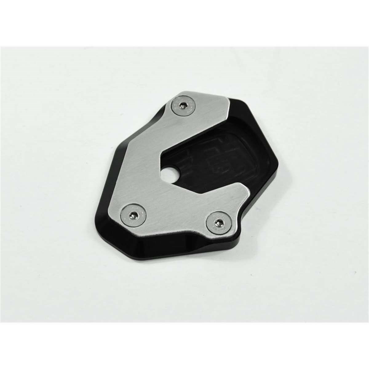 Der Seitenständerfuß vergrössert die Auflagefläche des Seitenständers und verbessert die Standfestigkeit auf unbefestigtem und weichem Untergrund. Er wird aus hochfesten Aluminium CNC-gefräst und schwarz eloxiert. Das Spannblech sowie die Schrauben sind aus Edelstahl, somit bietet dieser Seitenständerfuß eine lange Lebensdauer, sowohl optisch als auch funktional.