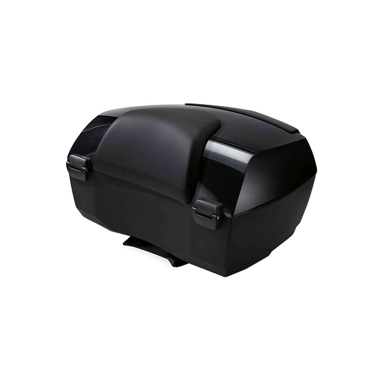 Beim großen Topcase mit Vollausstattung bietet die wasserdichte Gepäckbox mit einem Fassungsvermögen von 49 Litern Platz für bis zu zwei Helme. Dabei lässt sich das Topcase mit nur einem Handgriff auf der Gepäckbrücke befestigen. Der in der Fahrzeugfarbe lackierte Deckel ist mit zwei Gasdruckdämpfern versehen, die den Öffnungsvorgang sanft unterstützen. Hinzukommt eine Vollausstattung, die keine Wünsche offenlässt. So kann das Schloss bequem per Zentralverriegelung bedient werden, während die Innenbeleuchtung den Zugriff auf das Gepäck bei Dunkelheit erleichtert. Die Teppichauskleidung des Bodens sorgt schließlich dafür, dass die Reiseutensilien sanft und sauber untergebracht werden können. Mit dem großzügig bemessenen Rückenpolster genießt auch der Sozius maximalen Reisekomfort selbst auf ausgedehnten Touren. Die maximale Zuladung beträgt 10 kg, die empfohlene Höchstgeschwindigkeit mit montiertem Topcase liegt bei 180 km/h. Nützliche Optionen sind die maßgeschneiderte Innentasche, das passende Staufach für den Deckel oder die Zusatzbremsleuchte.