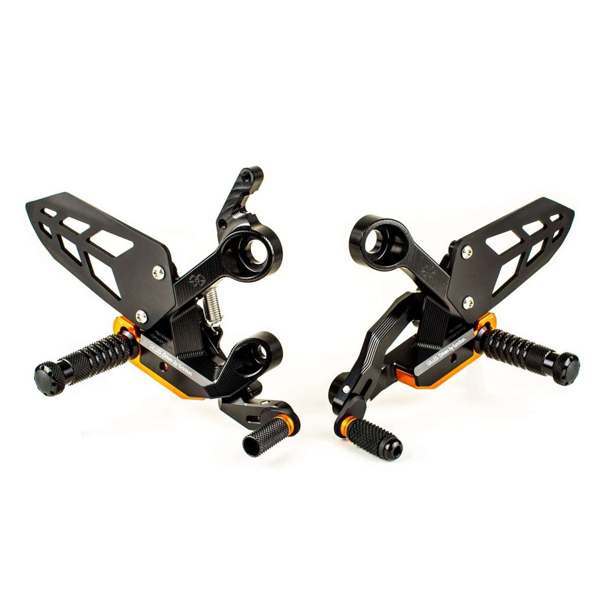 Komfortabel verstellbare Fußrastenanlage Hochfestes Aluminium AL7075 Perfekte Kombination: geringes Gewicht und Stabilität. Sowohl Normal- als auch Schaltumkehrung möglich. Beidseitiger Alufersenschützer. Vielfältige Einstellmöglichkeiten: Fußraste, Schaltweg, Trittlänge Präzise Positionierung durch präzisen Verstellschieber Schalt-/ Bremshebel: spielfrei doppelt kugelgelagert. Starre Racing-Rasten (Abbildungen zeigen teilweise optionale Klapprasten). Diese Fussrastenanlage benötigt für eine legale Nutzung im öffentlichen Straßenverkehr, zusätzlich noch klappbare Rasten.