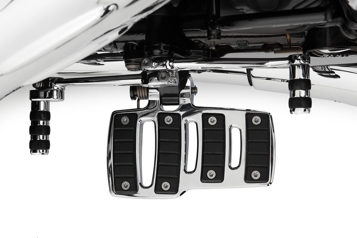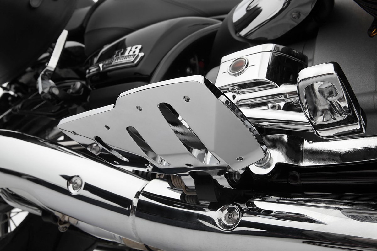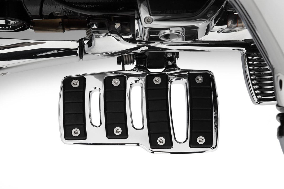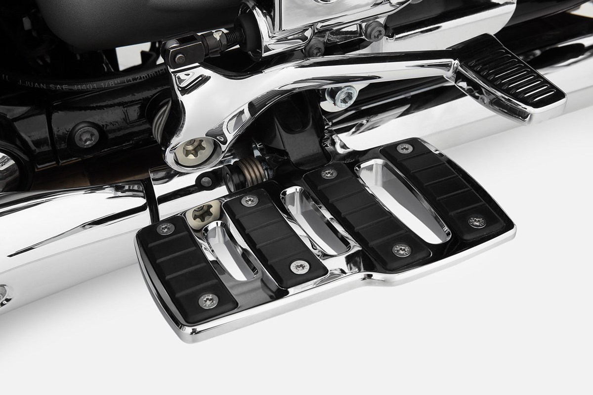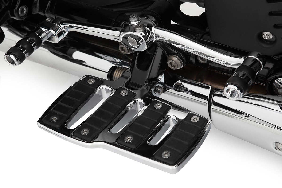 Edle, sorgfältig und mit viel Liebe zum Detail gefertigte Trittbretter. Solide dimensioniert und aus hochfestem Aluminium angefertigt. Die Güte und Qualität des Finishs und das integrierte Design sorgen für eine deutliche Aufwertung der Erscheinung des Big Boxers. Der gleiche Maßstab wurde an die Ergonomie der Trittbretter angelegt, die mit der vergrößerten Trittfläche nicht nur deutlich mehr Komfort bieten, sondern auch zur erhöhten Fahrsicherheit beitragen. Die auf das Design der Trittbretter abgestimmten Gummiauflagen bieten hervorragenden Grip beim Fahren und dämpfen jegliche Vibrationen. Sie sind austauschbar.