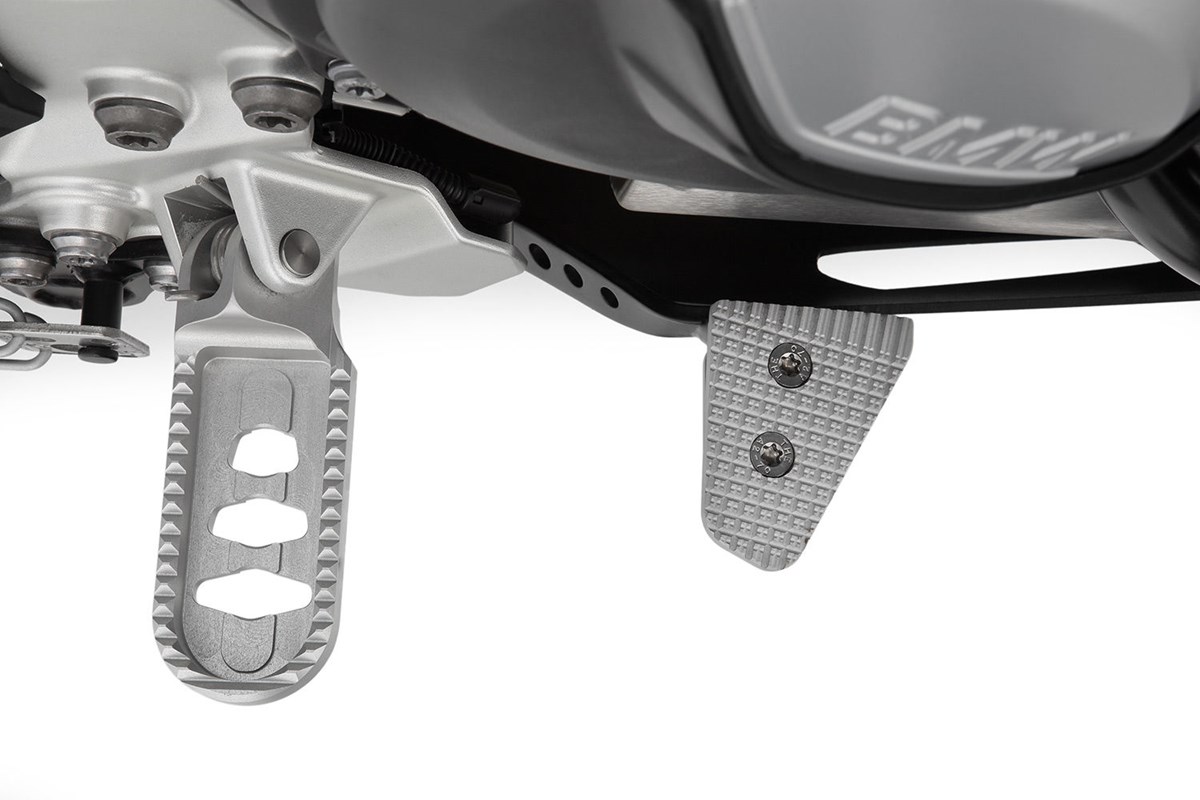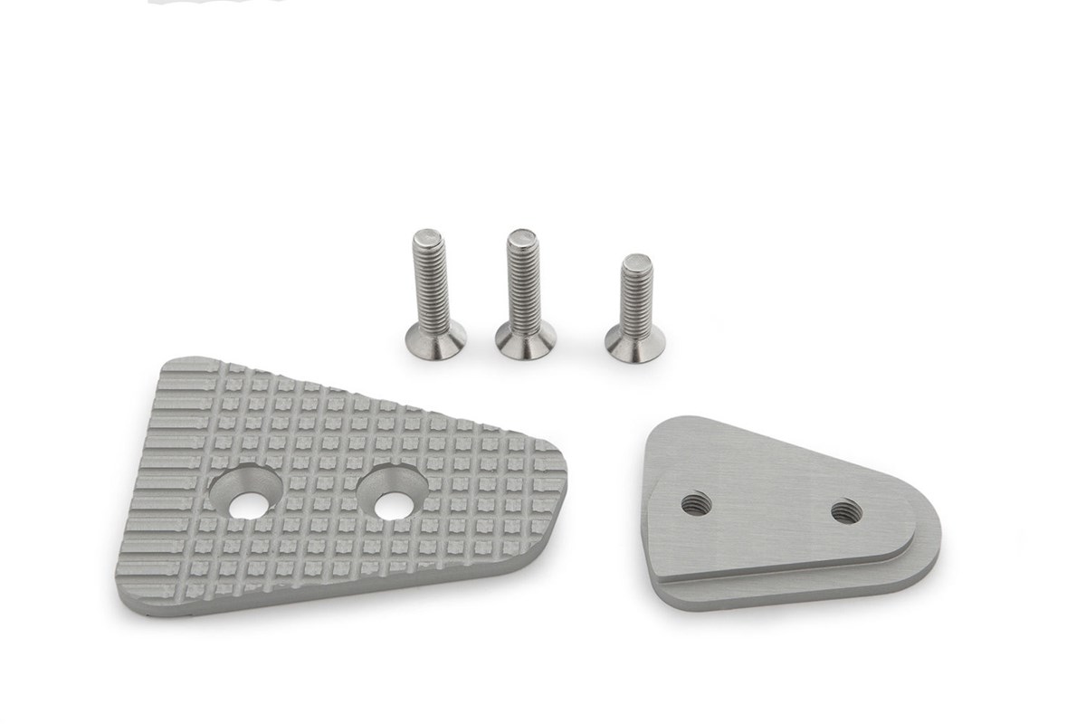 Im Original ist die Fußauflagefläche des Bremshebels leider etwas klein geraten und stellt nicht selten ein Sicherheitsrisiko dar. Diese Fußbremshebel Vergrösserung dient als Ergänzung des originalen Fußbremshebels. Sie wird einfach auf den Hebel aufgeschraubt. Versehentliches Abrutschen oder das Verfehlen des Hebels und der damit verbundene Tritt ins Leere“ wird damit fast unmöglich. Die aufwändig gefräste Riffelung sorgt für Rutschsicherheit bei Nässe. Die Auflagenvergrößerung verbessert Ergonomie und Komfort und erhöht damit die passive Sicherheit.