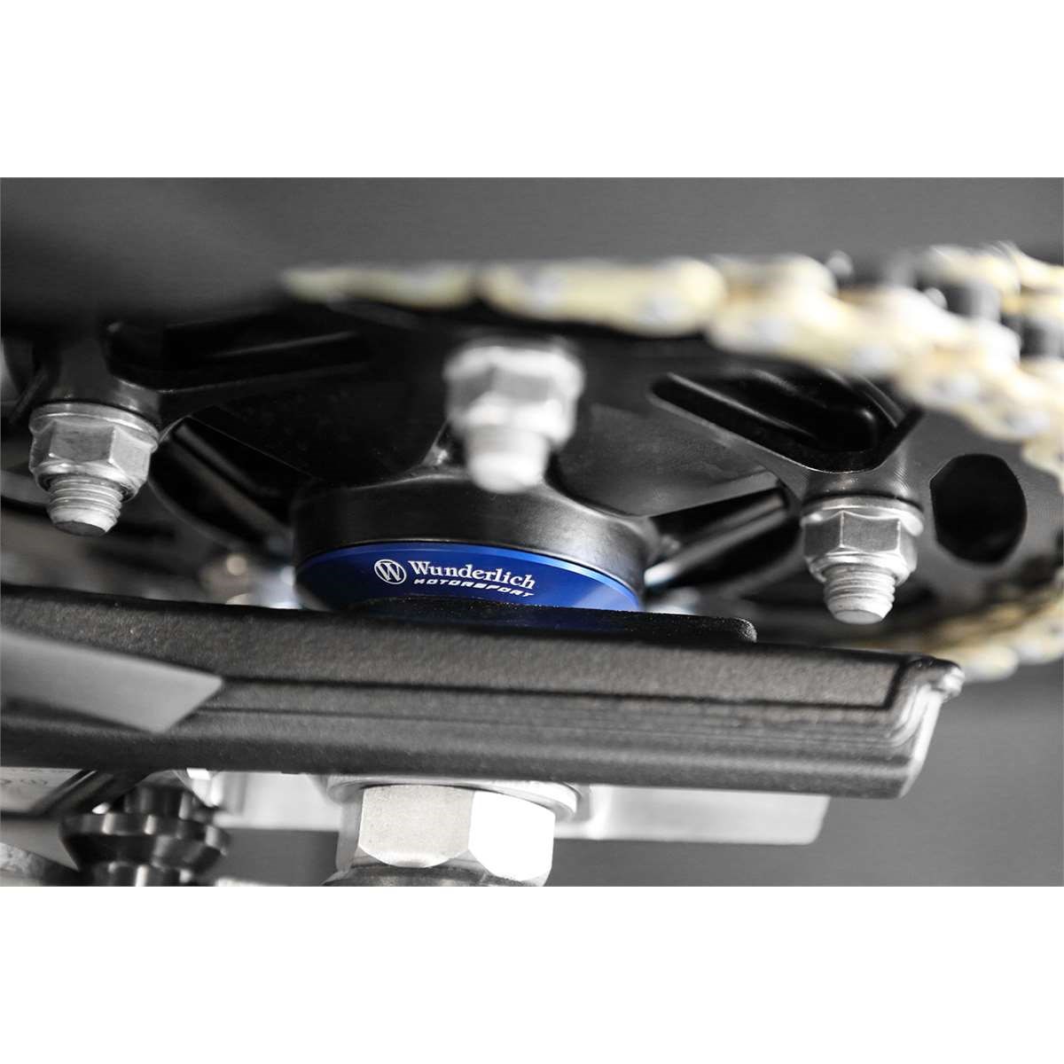 Erfahrungsgemäß fallen die originalen Distanzhülsen beim Ausbau des Hinterrads leicht aus ihrem Sitz. Wird das Rad, z.B. nach dem Reifenwechsel, wieder montiert, neigen die Serienhülsen zum Verkanten, sodass der Einbau meist sehr „fummelig“ ist und die Geduld auf die Probe stellt. Die von uns entwickelten Raddistanzhülsen werden anstelle der serienmäßigen Hülsen formschlüssig jeweils in den Radial-Wellendichtring von Felge und Kettenradträgers eingesteckt. Aufgrund ihrer Konstruktion sind diese dann fixiert und das Herausfallen wird beim Radwechsel zuverlässig verhindert. Die Distanzhülsen sind darüber hinaus großzügig, flach angefast, sodass das Einführen und die Montage des Rads spürbar leichter und schneller zu bewerkstelligen ist. Ursprünglich für den Rennsport entwickelt haben sie sich als sehr hilfreich erwiesen, um die Standzeiten in der Box deutlich zu reduzieren, wenn das Rad ausgebaut werden muss. Wir nutzen die bewährten »TRACKDAY«-Hülsen bei unseren Rennmaschinen regelmäßig im Rennbetrieb. Die Raddistanzhülsen fertigen wir aus hochwertigem Aluminium und eloxieren sie in Blau. Mit Wunderlich MOTORSPORT-Logo.