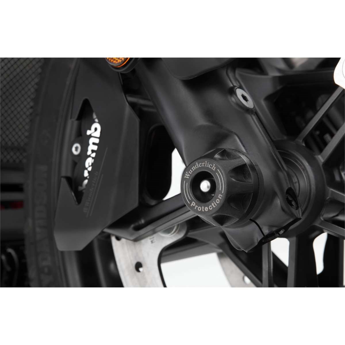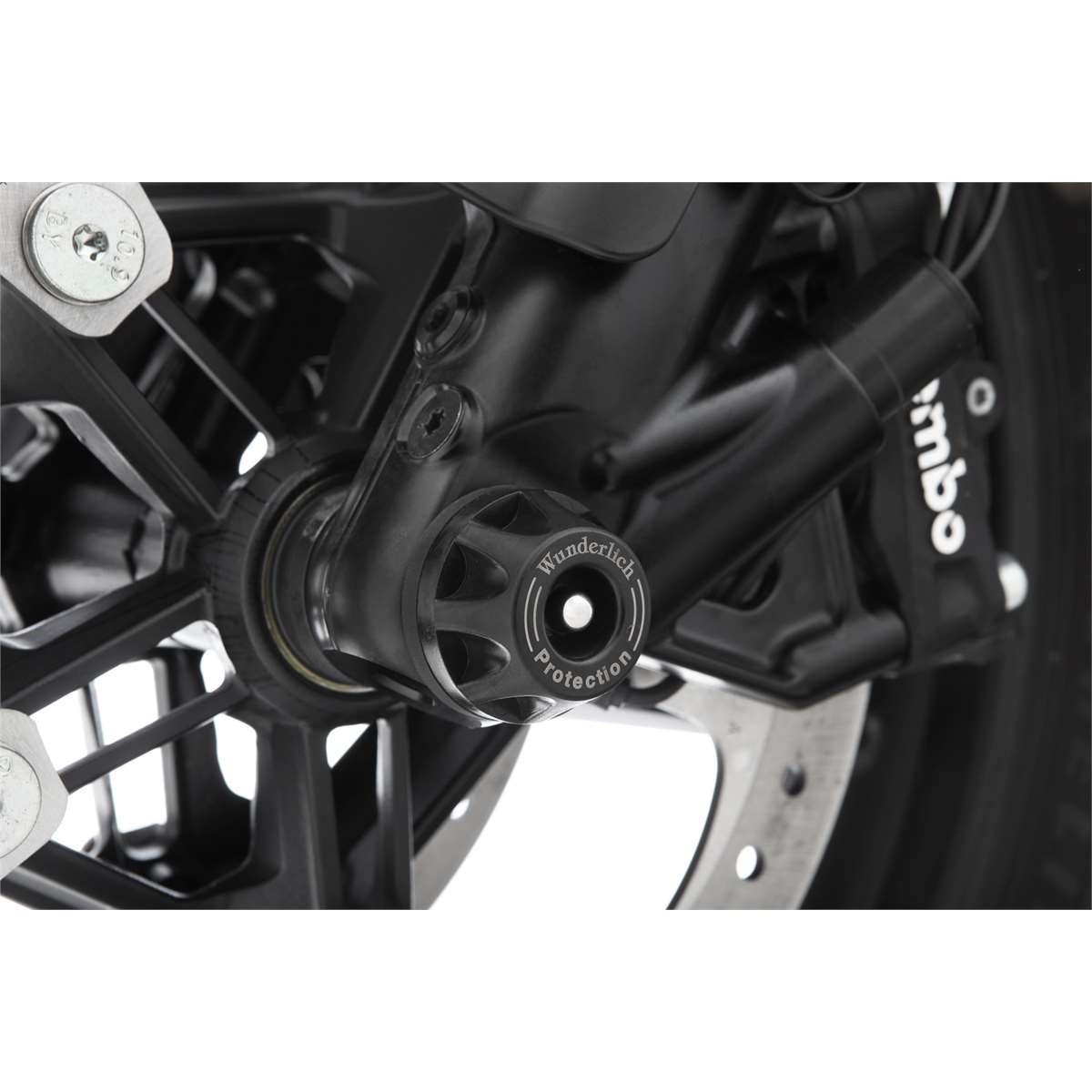 Die Achs-Schutzpads sorgen im Falle des Umfallens des Motorrads oder bei einem Sturz dafür, dass die Gabel, die Radachse und Bremsanlage effektiv vor Beschädigungen geschützt werden.