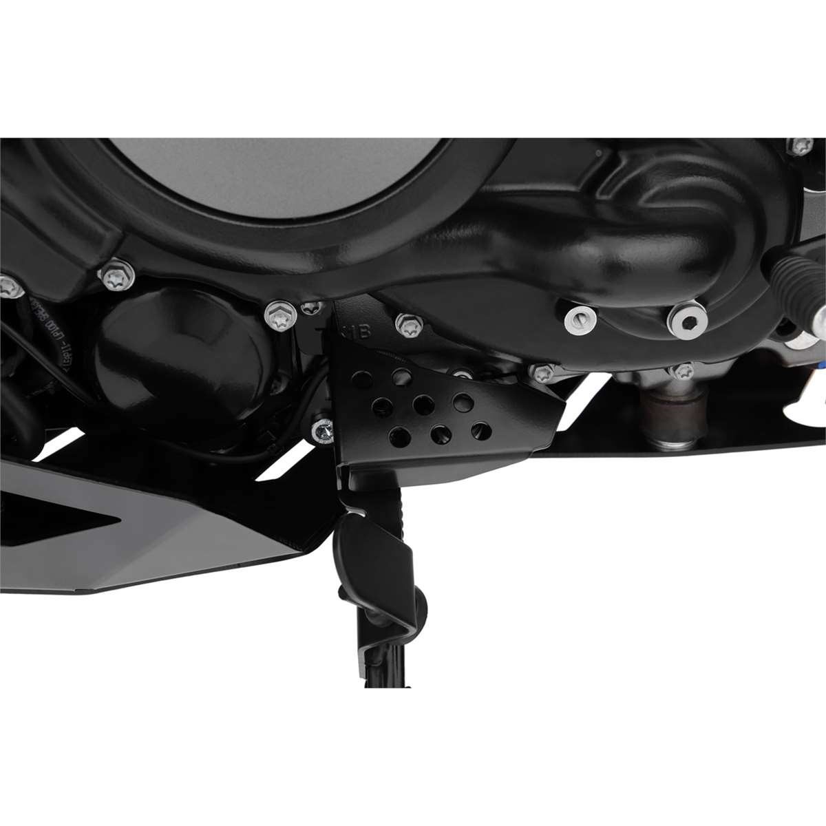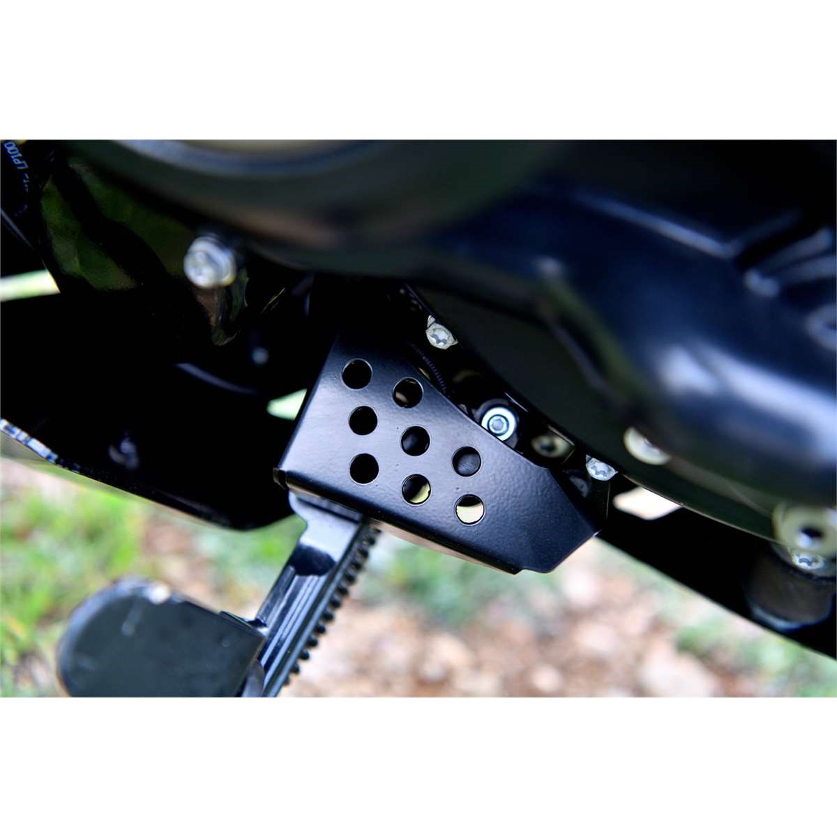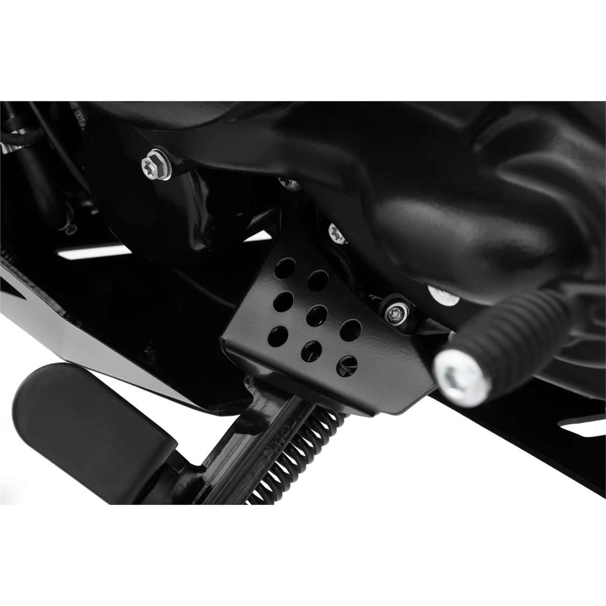 Der Schalter, der für die zuverlässige Zündunterbrechung bei ausgeklapptem Seitenständer sorgt, hat schon viel Kummer verhindert. Denn das Losfahren mit ausgeklapptem Seitenständer kann sehr unangenehme Folgen für Fahrer und Maschine haben. Es ergibt also Sinn, den exponierten Schalter vor Beschädigungen durch Steinschlag oder Sturz anständig zu schützen. Denn wird der Schalter beschädigt, springt der Motor nicht mehr an. Die hohe Schutzwirkung ergibt sich aus der Steifigkeit des gekanteten, mit zwei längs eingefrästen dezenten Öffnungen versehenen, 2 mm-Aluminiumblechs. Es umrahmt den exponierten, Schalter mit seiner stabilen Zweipunktbefestigung und schützt diesen sicher. Damit wird die Gefahr der Beschädigung des Schalters besonders im engagierten Offroadeinsatz zuverlässig reduziert. Die Montage erfolgt unkompliziert an den gut zugänglichen Befestigungspunkten am Fahrzeug.