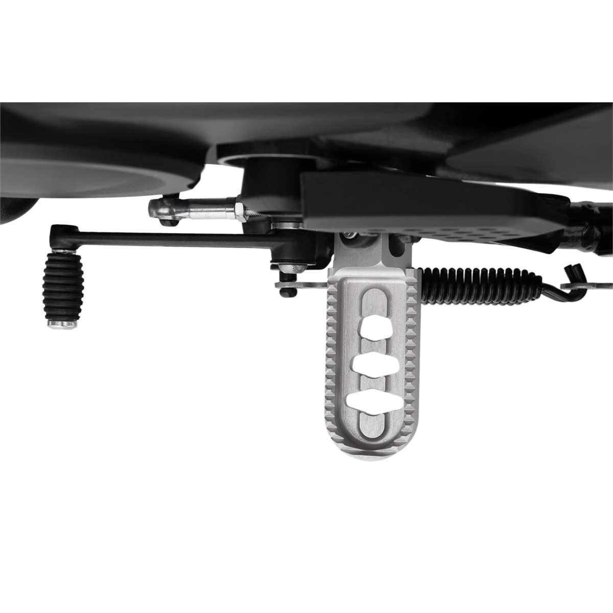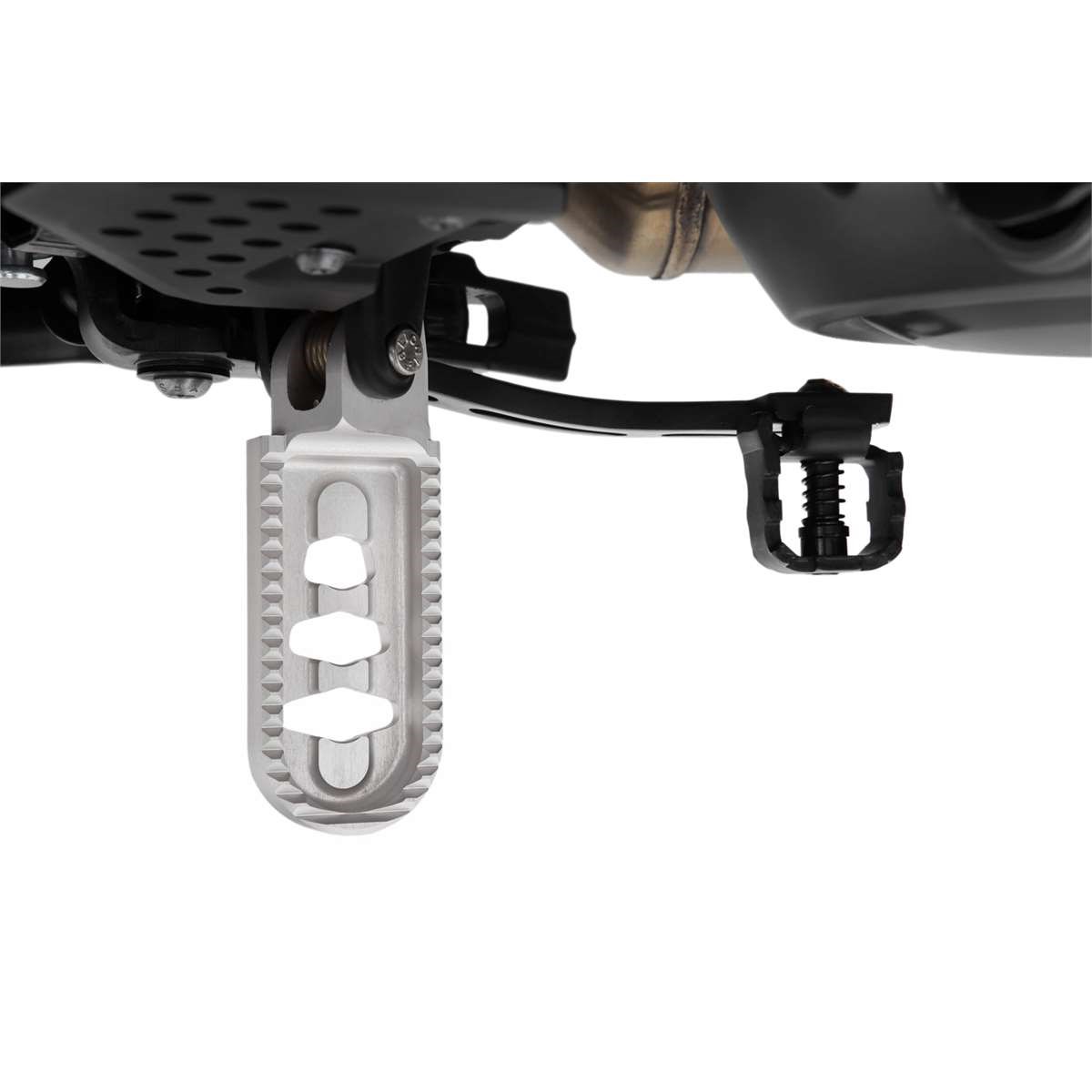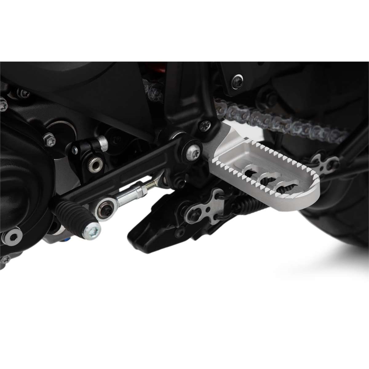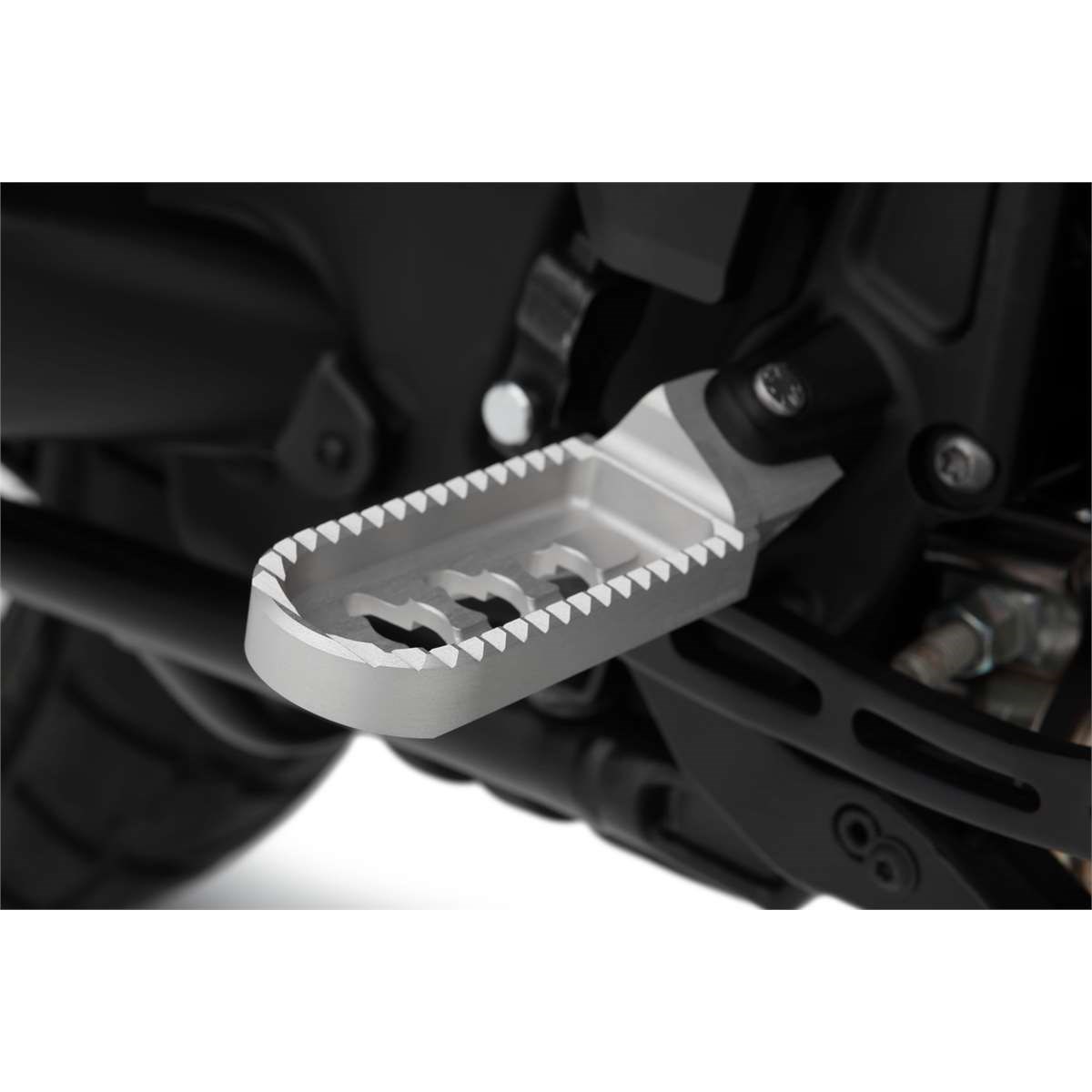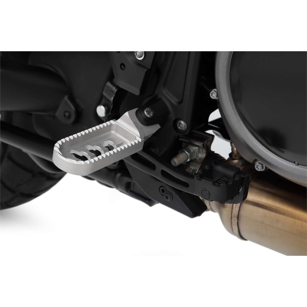 Mit unserer durchdachten Konstruktion erreichen wir eine spürbare, ergonomisch wirksame Tieferlegung, ohne die Rastenbasis und damit die Fußauflage nennenswert nach außen zu verlagern. Eine Maßnahme, die wiederum dem Komfort zuträglich ist. Gleichzeitig bleibt die Schräglagenfreiheit auf hohem Niveau erhalten. Die gute Erreichbarkeit von Schalt- und Bremshebel und deren sichere Bedienung machen das Fahren zum Vergnügen.