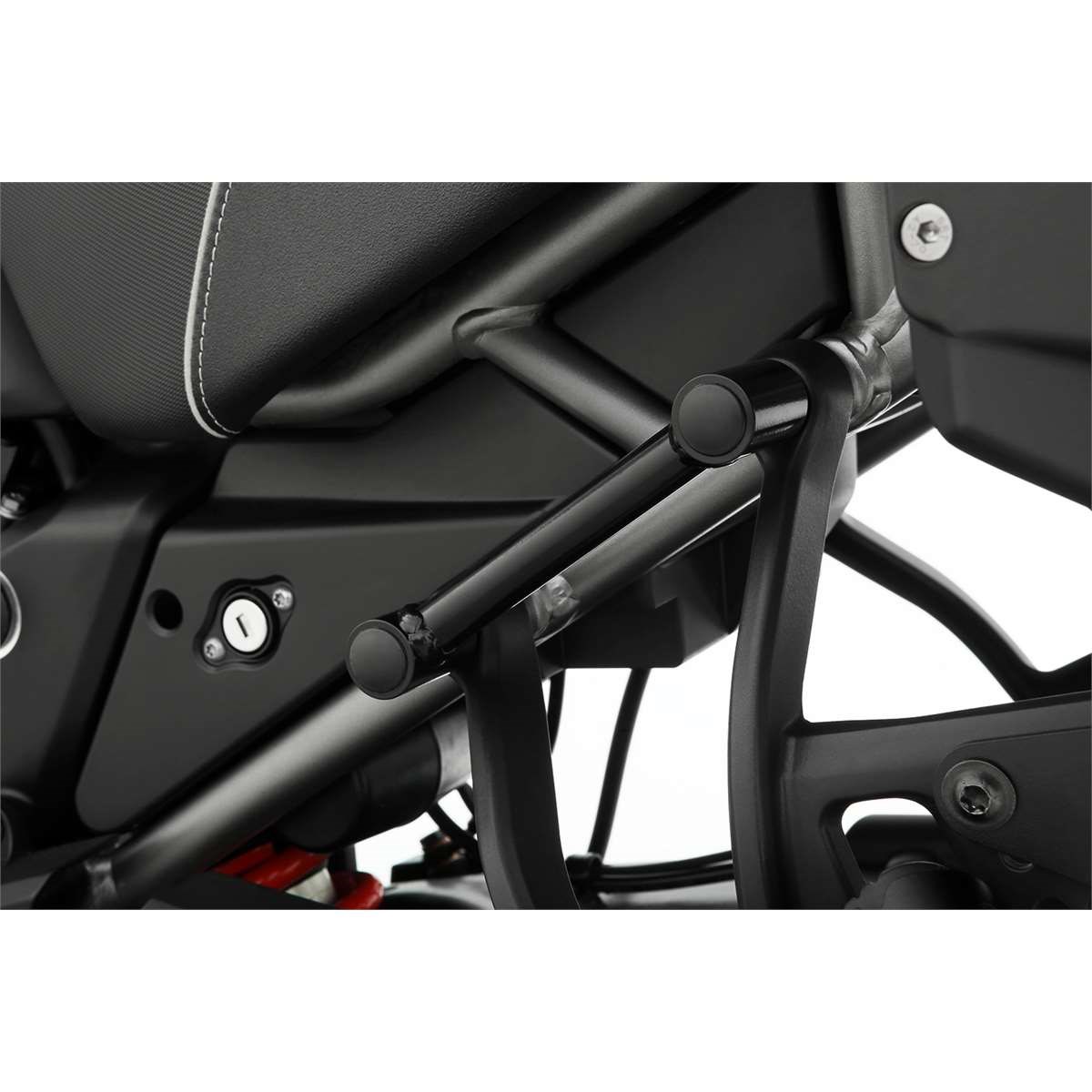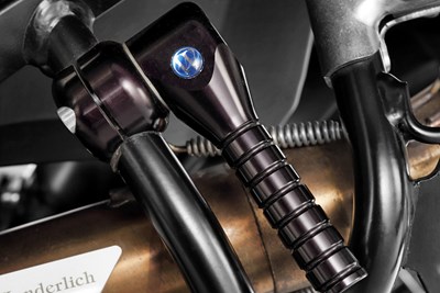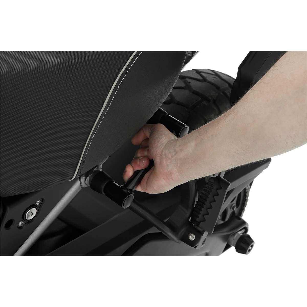 Leider bietet die Pan America keinen geeigneten Hebel, um benutzerfreundlich auf den Hauptständer aufgebockt zu werden. Dieses hilfreiche und ergonomische Bauteil optimiert das Hebelverhältnis - nicht nur bei voll beladener Maschine. Der Aufbockgriff wird links an der Soziusrastenaufnahme montiert und bietet dort einen stabilen Sitz. Dort montiert lässt sich die Maschine spürbar leichter und vor allem sicherer auf den Hauptständer aufstellen, Dies liegt daran, dass der Griff gut in der Hand liegt und man damit deutlich mehr Kraft übertragen kann, als an Rahmenrohren, die schlecht zu greifen oder durchs Gepäck gar nicht zugänglich sind. Wir fertigen unseren Aufbockgriff sehr hochwertig aus Stahl, das Design ist funktional.
