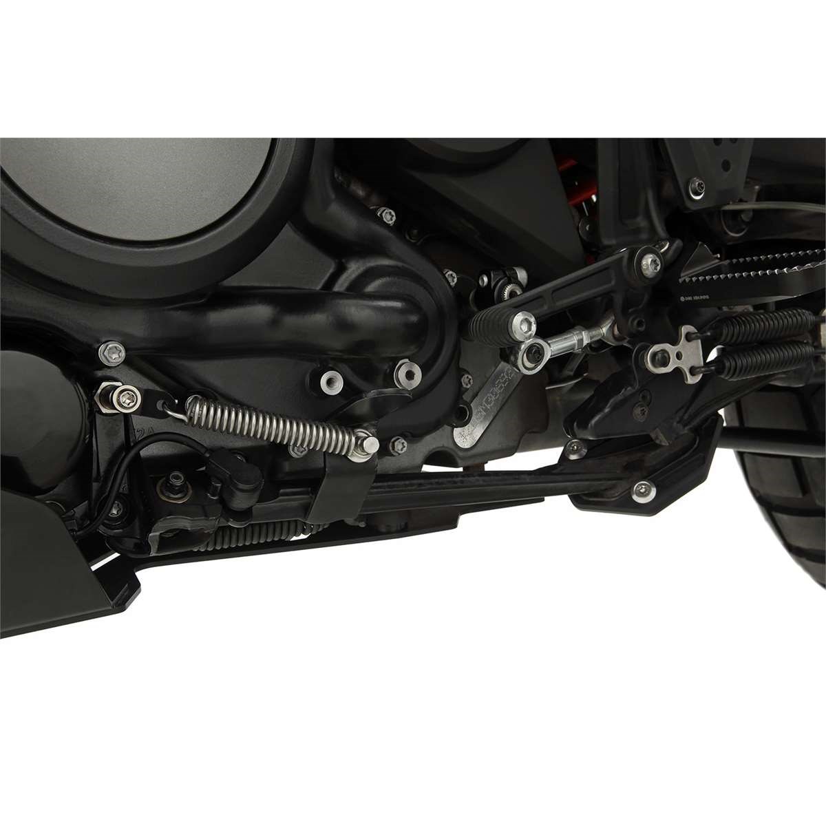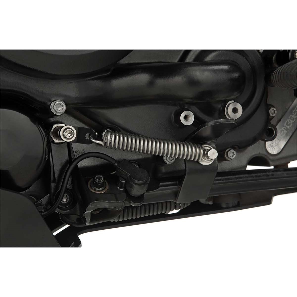 Wenn der Seitenständer der Harley-Davidson während der Fahrt unmotiviert auf und ab wippt, hat das einen Grund. Die Hebelverhältnisse und die Totpunktlage, bei der die Rückholfeder den Seitenständer sicher in der oberen, eingeklappten Endposition (Fahrposition) halten soll, stellt sich nicht selten als indifferent heraus. Das hat zur Folge, dass die Federkraft nicht ausreicht, den Seitenständer in der eingeklappten Position kraftschlüssig, zuverlässig und sicher zu fixieren. Das ist ärgerlich, denn der Seitenständer kann sich - wie erwähnt - so während der Fahrt labil wippend bewegen.