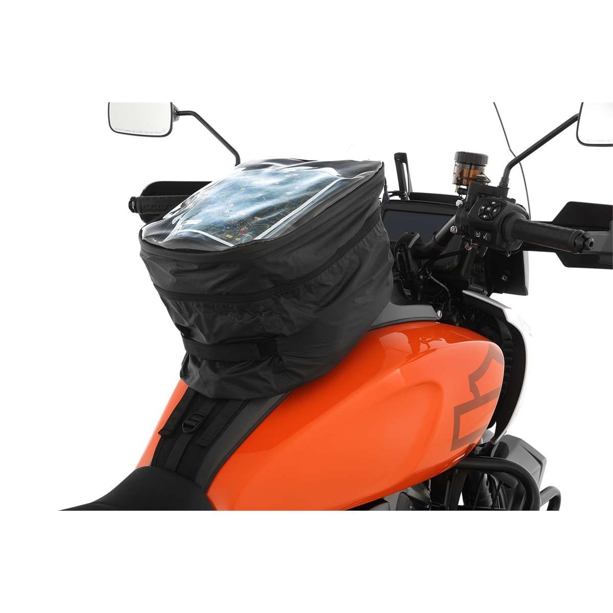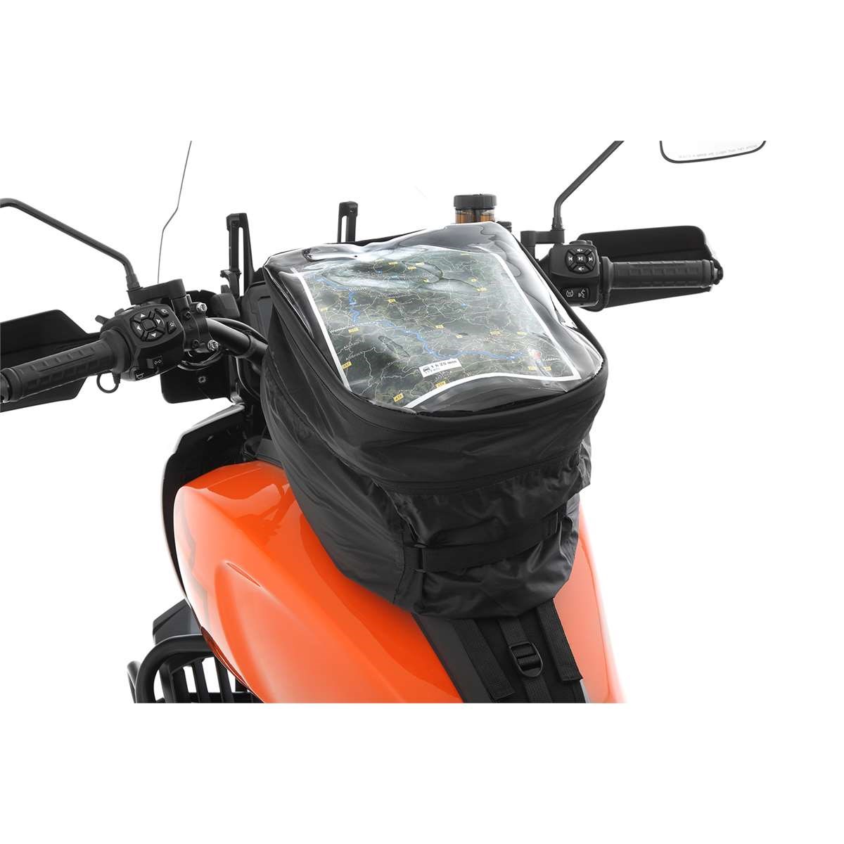 Der Zugang zum Tankrucksack ist von oben ohne Abnehmen der Regenhaube mit Hilfe eines umlaufenden Reißverschlusses möglich. Das Sichtfenster kann nach dem Öffnen einfach aufgeklappt werden