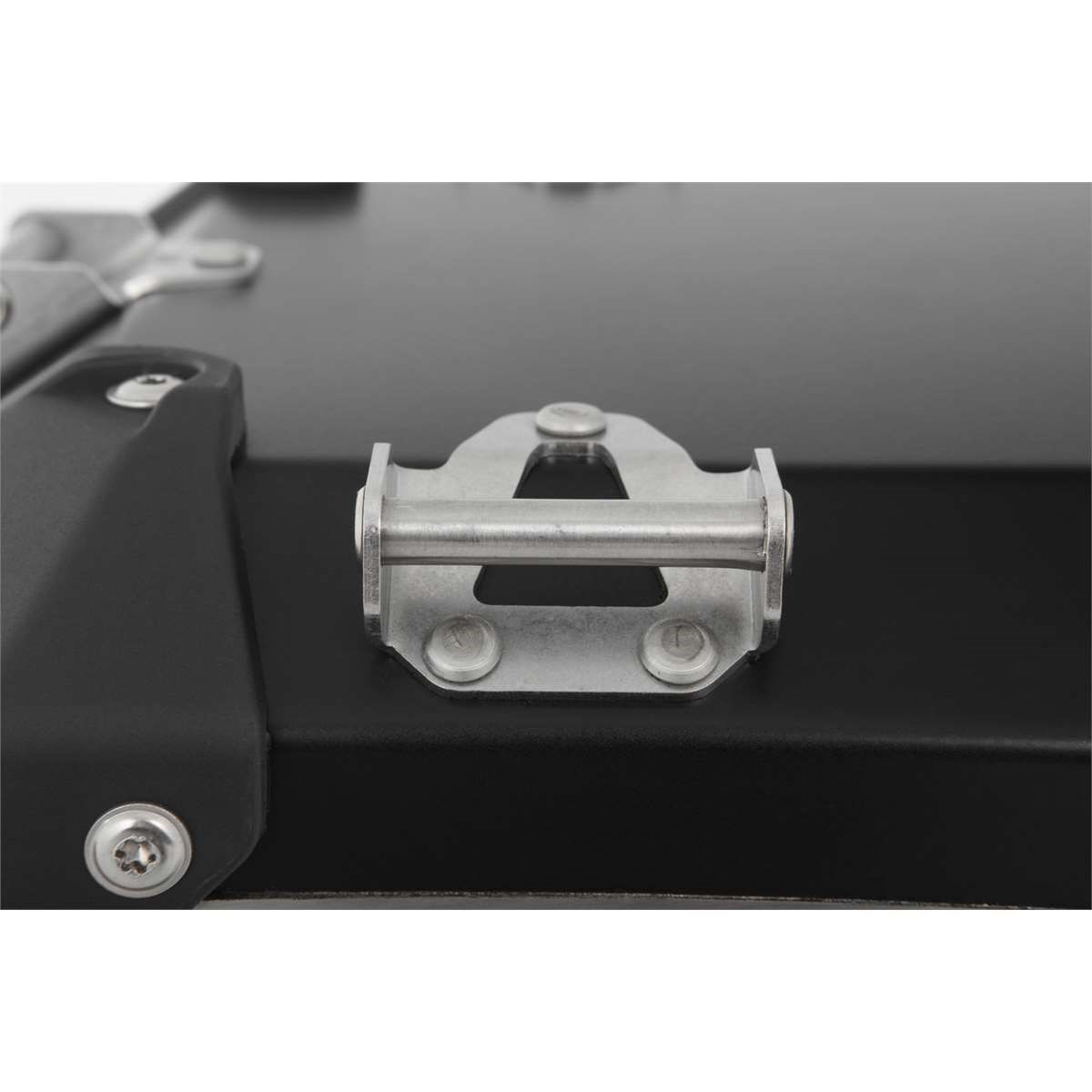 Nach dem Öffnen der beiden, jeweils vorne und hinten angebrachten, Scharnierschlösser kann der Deckel komplett entfernt und die Koffer können bequem von oben beladen werden. Wird nur eines der beiden Schlösser geöffnet, dient der zweite Verschluss als Scharnier. So lässt sich der Deckel wahlweile nach vorne oder hinten aufstellen und wird dabei durch ein Fangseil gehalten.