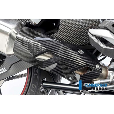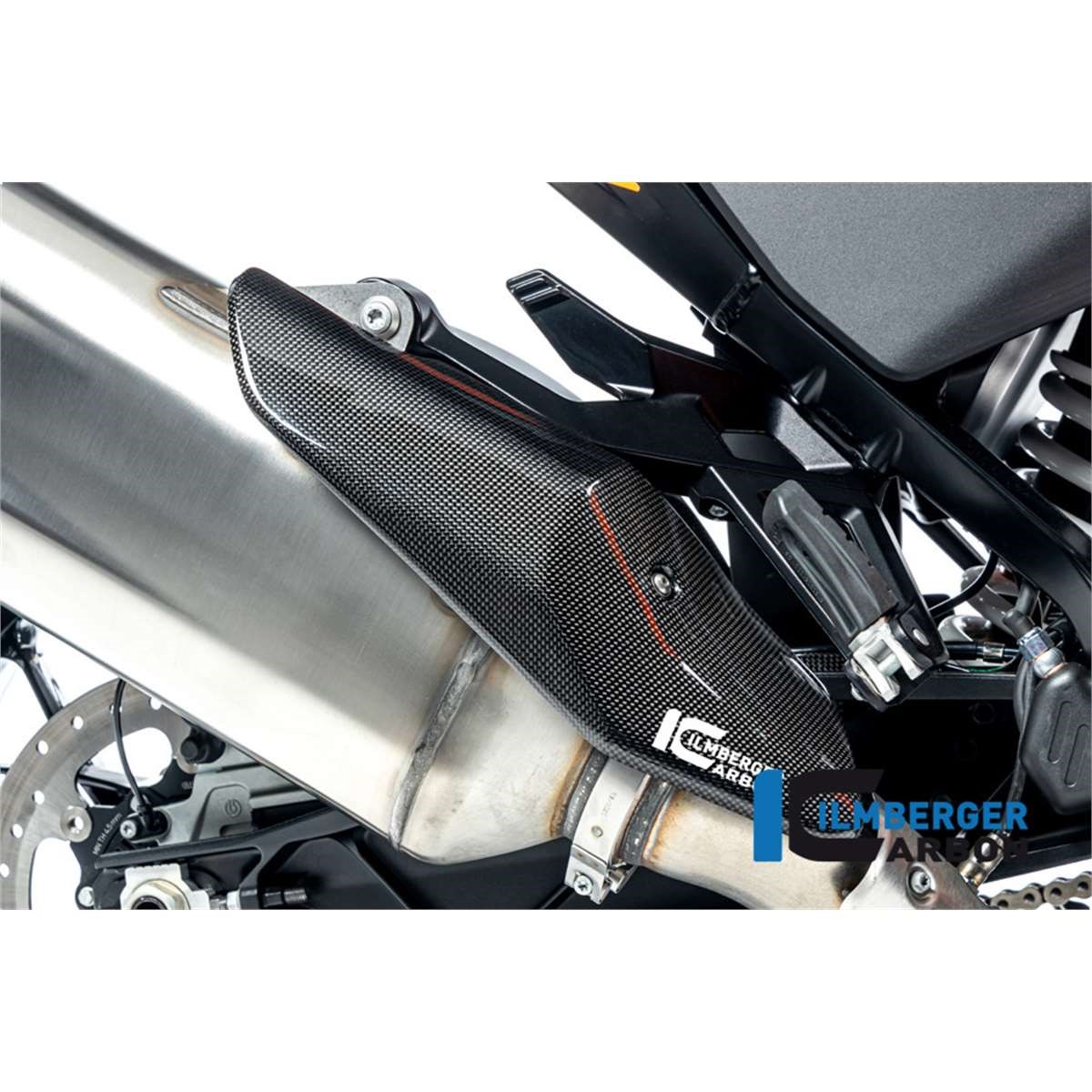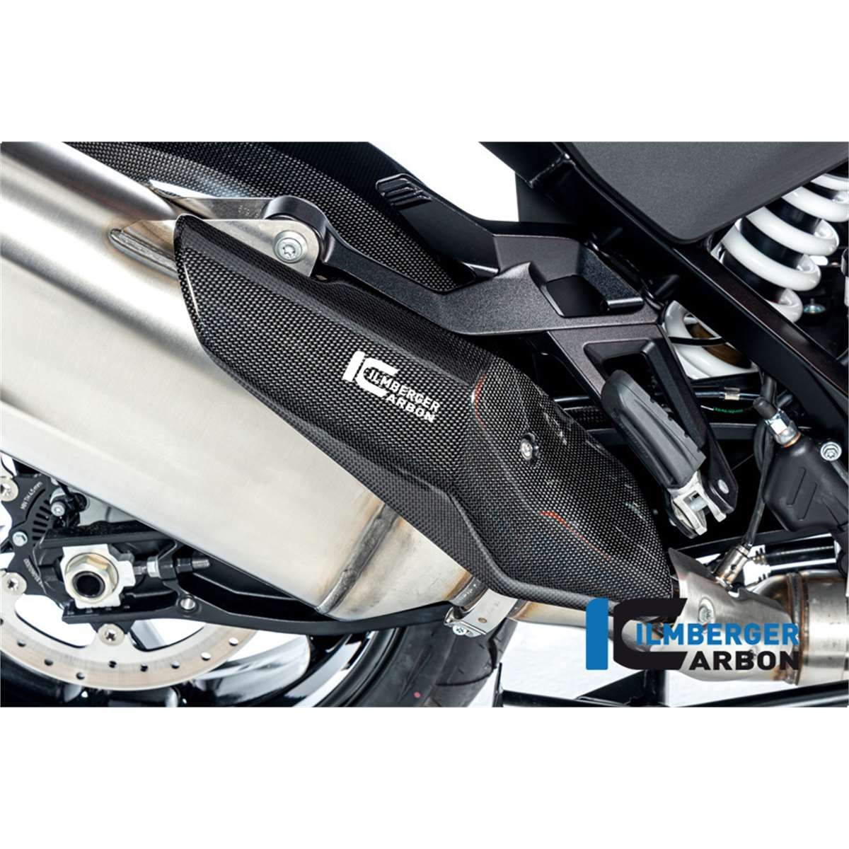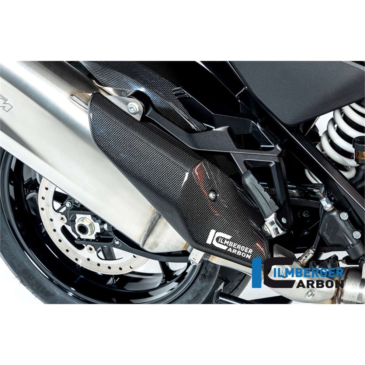 Durch die Kombination aus eleganter Rundung und harter Kante schmiegt sich der Auspuff Hitzeschutz aus Carbon wie kein anderer in die moderne Linienführung der KTM 1290 Super Adventure ein. Aber nicht nur optisch, sondern auch technisch bietet er viele Annehmlichkeiten. Hochwertiges Carbon leitet Hitze deutlich langsamer als es die Materialien des Originalteils würden. So bleibt die Außenseite im Vergleich spürbar kühler und der Fuß besser vor Verbrennungen geschützt.