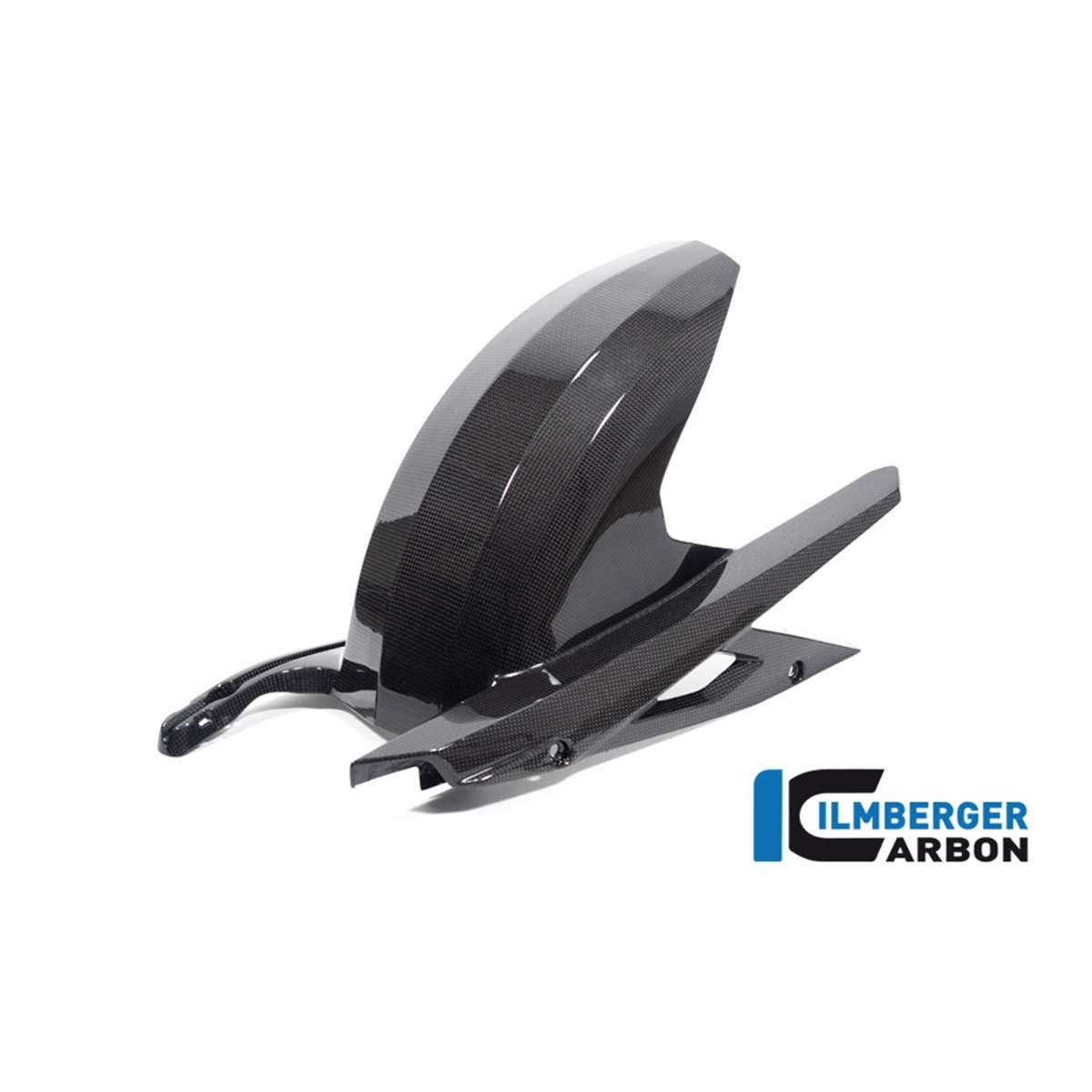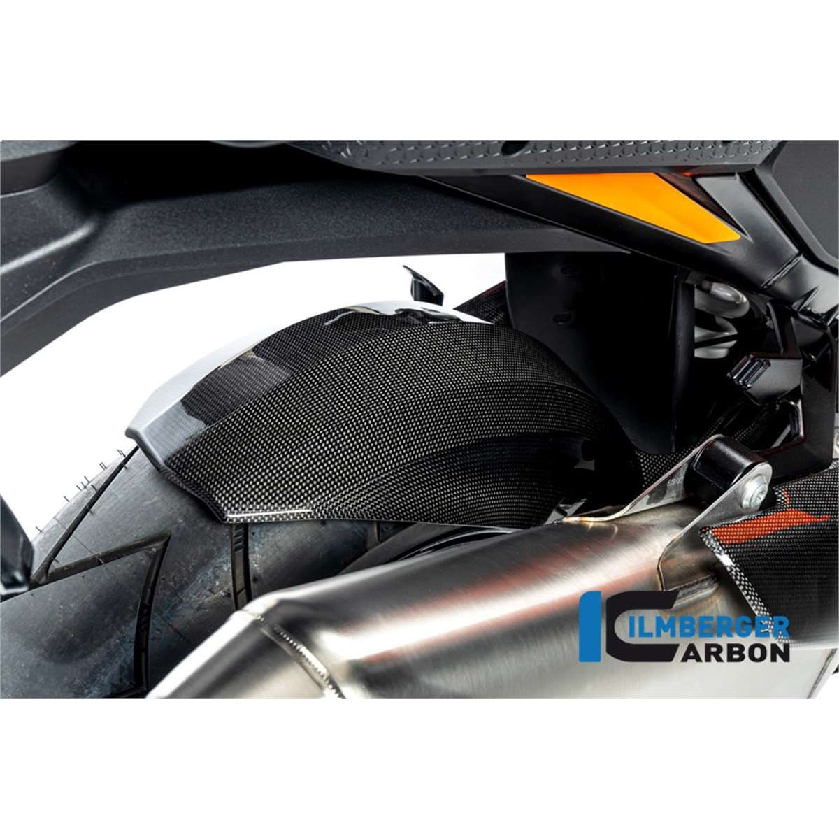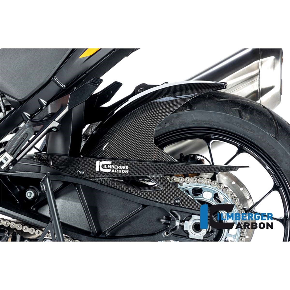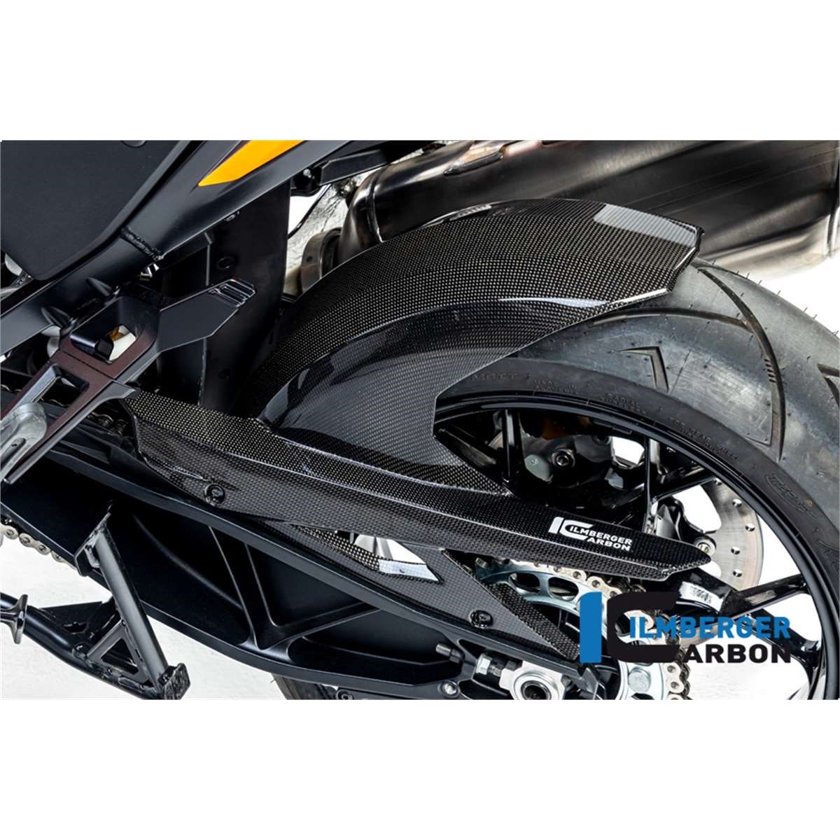 An den originalen Befestigungspunkten verschraubt, bewährt sich der hintere Kotflügel aus Carbon in allen Lebenslagen. Er schützt Fahrer und Motorrad deutlich besser vor dem vom Hinterrad kommenden Schmutz. Auch der exponierte Kettenschutz wurde bei seiner Konstruktion gegenüber dem Originalteil verlängert. Damit gehören ungewollte Flecken an Bike und Fahrer durch eine gut geschmierte Kette der Vergangenheit an.
