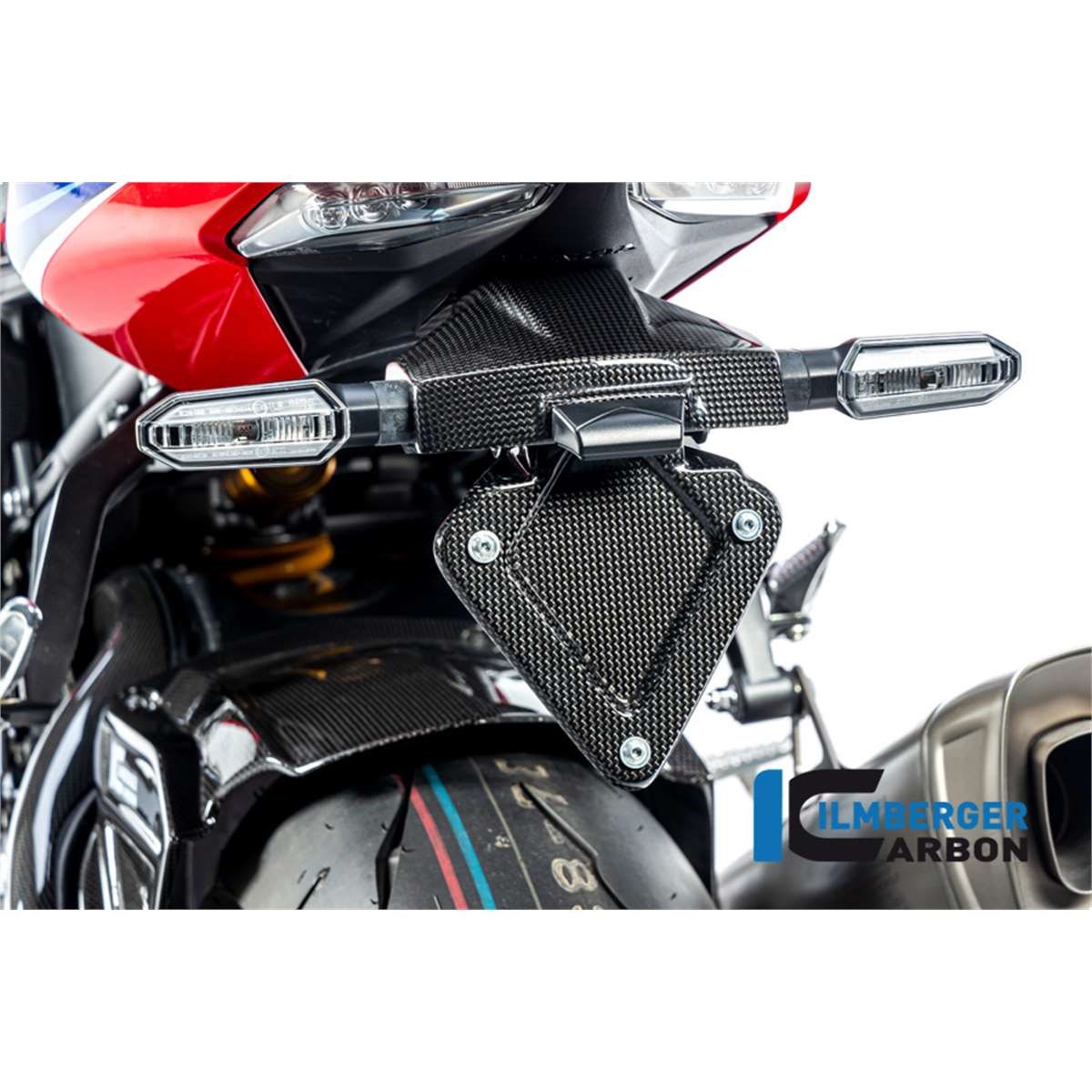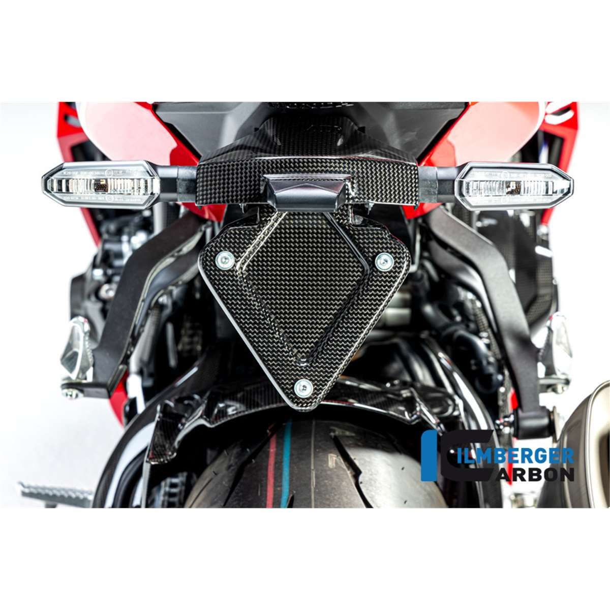 Der Kennzeichenhalter aus Carbon in glänzendem Finish für die Honda CBR 1000 RR-R/SP ab BJ 2020 ersetzt das originale Bauteil unter Verwendung der originalen Befestigungspunkte.