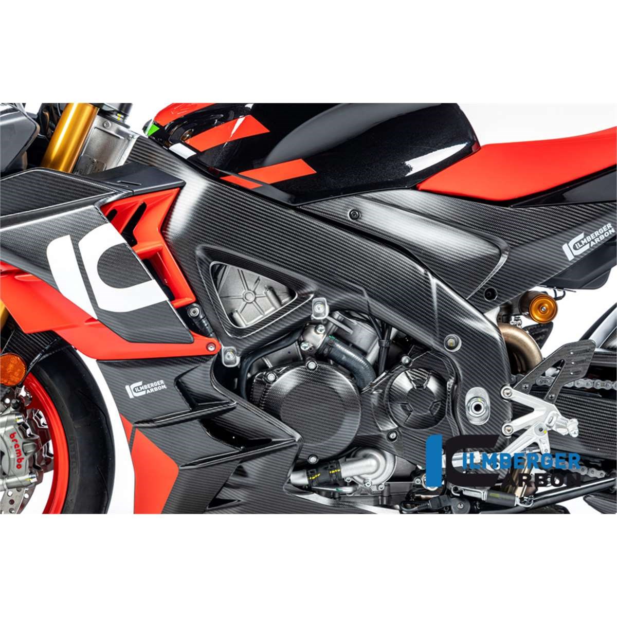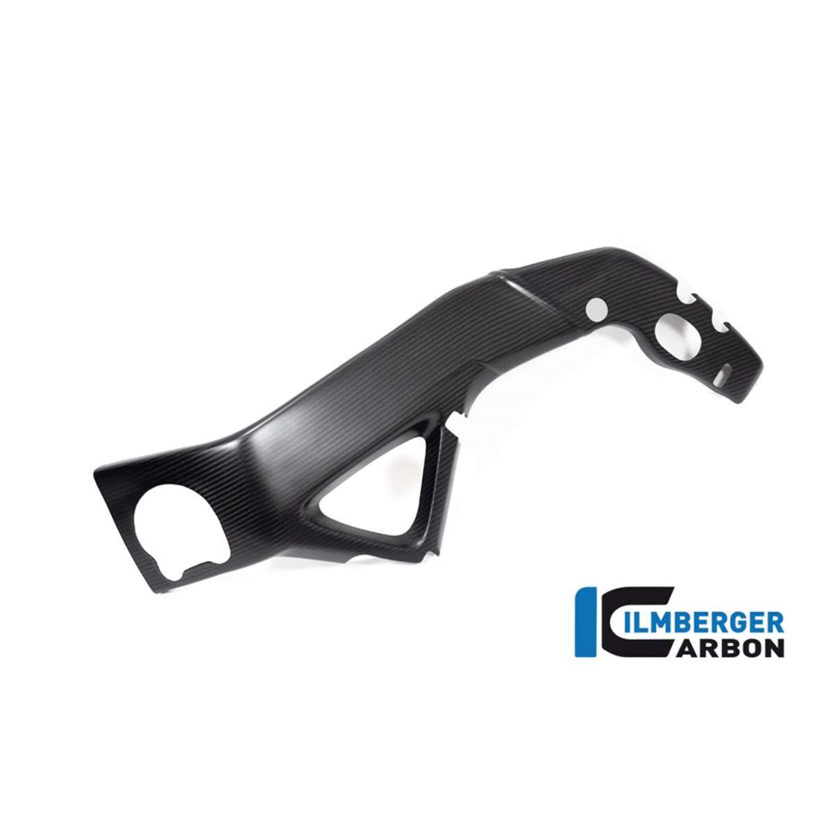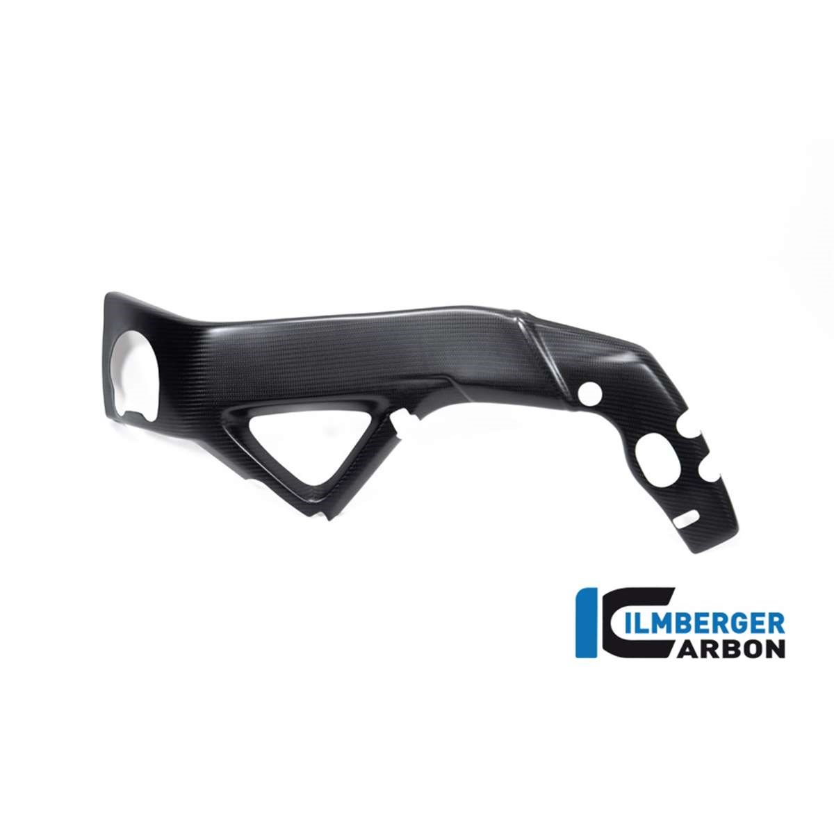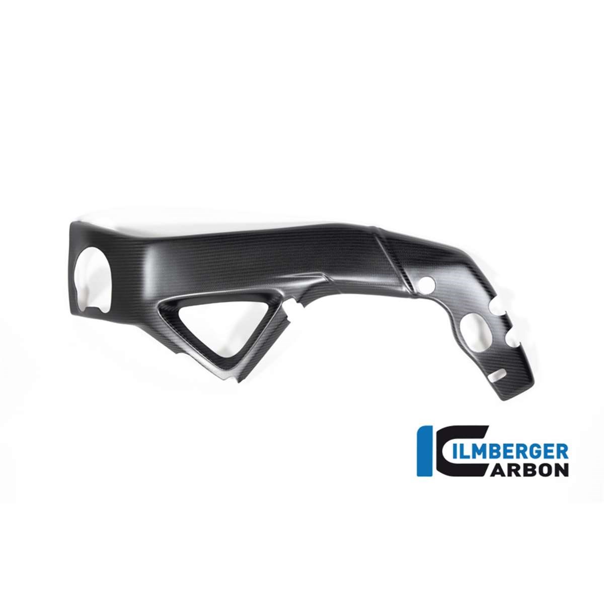 Die Rahmenabdeckung aus Carbon wird direkt auf den Rahmen aufgebracht. Sie verdeckt diesen und zieht die Blicke auf sich. Aber nicht nur optisch kann die Rahmenabdeckung überzeugen. Dank der hohen Oberflächengüte von Ilmberger Carbon, hält die Rahmenabdeckung auch intensivger Nutzung über einen langen Zeitraum stand. Somit gibt es weder nach unzähligen langen Touren, noch bei der täglichen Nutzung des Motorrads unangenehme Arbiebsflecken auf der rauen Gussoberfläceh des Rahmens. Um den hochwertigen Eindruck zu perfektionieren, verläuft die Rahmenabdeckung nicht nur an der senkrechten Rahmenstrebe, wo das Bein schleift, sondern zieht sich noch weit nach oben, wo sie unter der dichten Seitenverkleidung verschwindet. Somit ist von außen nur schwer zu erkennen, wo die Rahmenverkleidung anfängt und wo sie endet.
