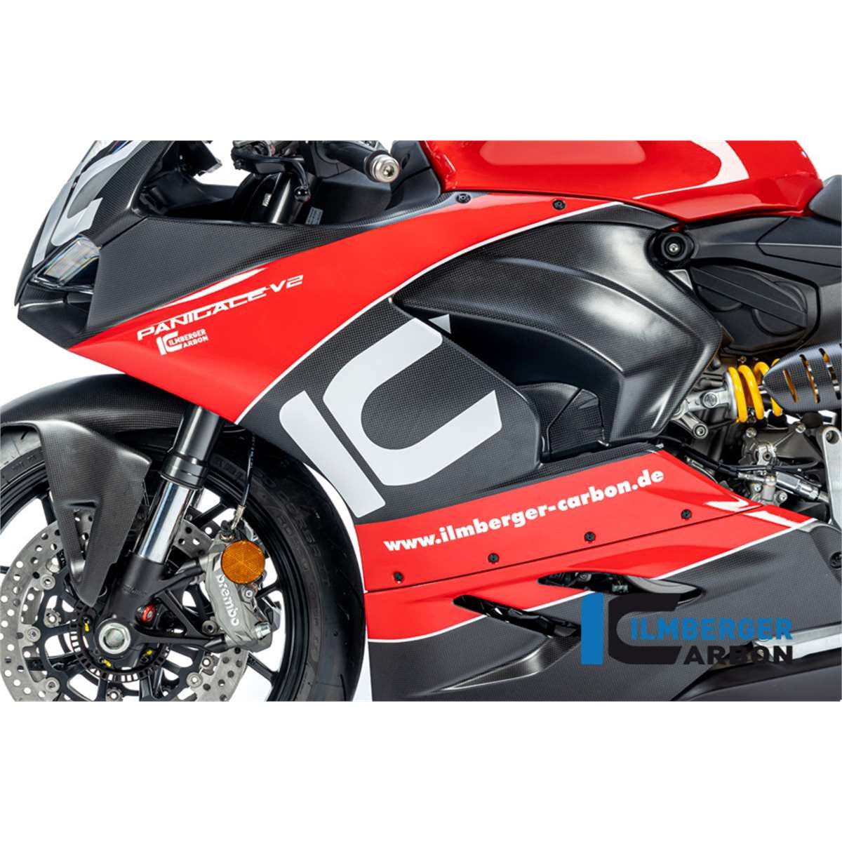 Das Verkleidungsseitenteil links in matt aus Carbon für die Ducati Panigale V2 ersetzt das originale Bauteil unter Verwendung der originalen Befestigungspunkte. Diese Version der Seitenverkleidung ist für eine Montage ohne Winglets konzipiert.