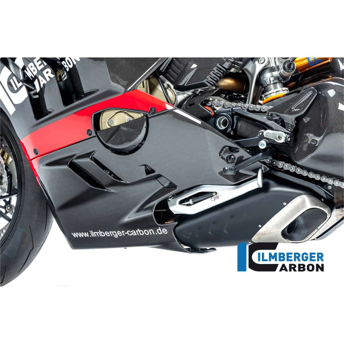 Das Verkleidungs-Unterteil links in Glanz aus Carbon für die Ducati Panigale V4 / V4 S 2022 ersetzt das originale Bauteil unter Verwendung der originalen Befestigungspunkte.
