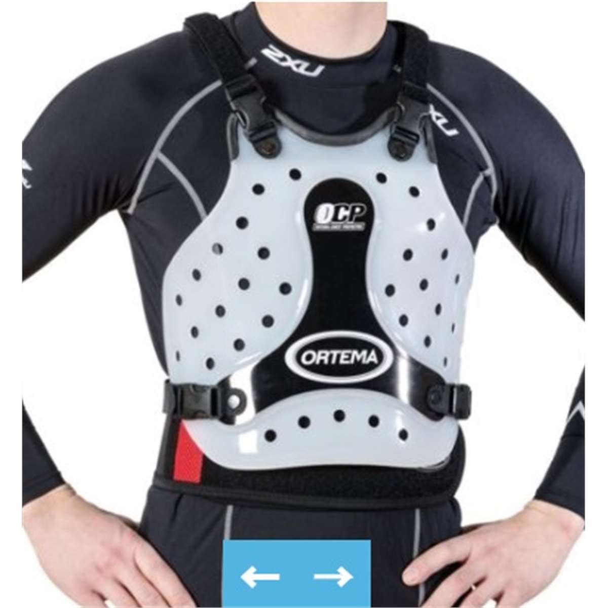 Zertifizierter Brustprotektor aus unzerbrechlichem Kunststoff für Motorsportler, der eng am Körper anliegt und Rippen, Brust sowie innere Organe im Falle eines Sturzes schützt.