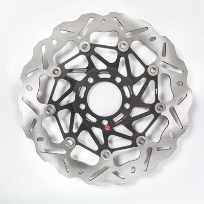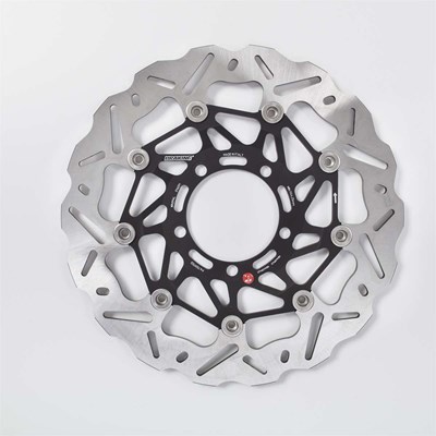 Bremsscheibe vollschwimmend mit gelochtem Stahlaussenring im Wave Design, Innenring aus Aluminium.