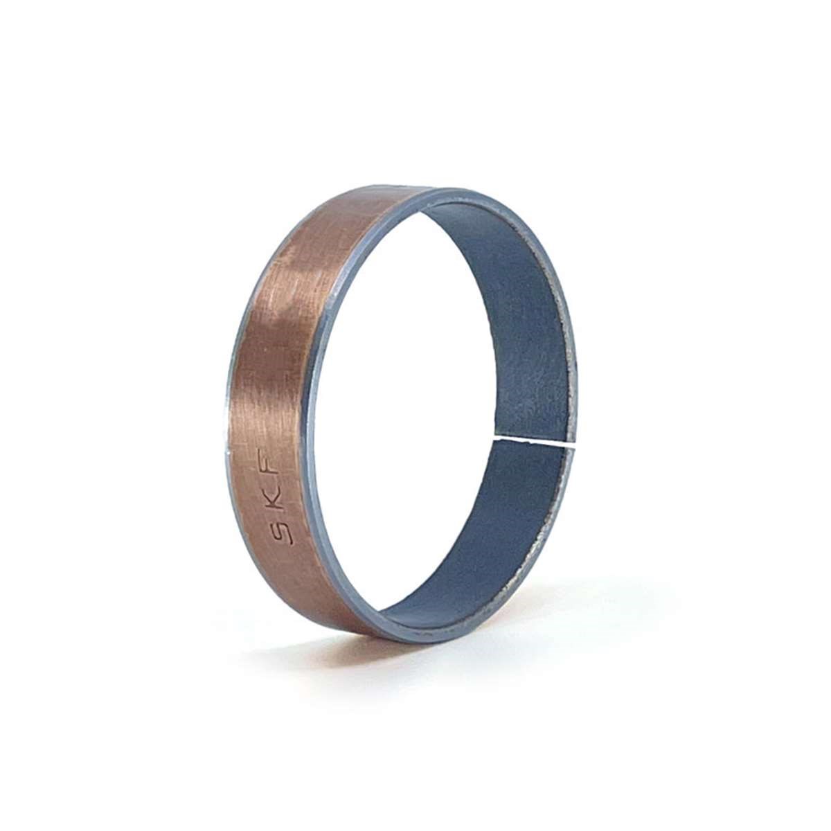 SKF Gabelbuchsen kombinieren die mechanische Festigkeit von Stahl mit der geringen Reibung einer selbstschmierenden Gleitschicht auf PTFE-Basis. Die dazwischen liegende dünne Bronzeschicht sorgt für eine feste Verbindung zwischen der Stütz- und der Gleitfläche und verbessert die Ableitung der im Betrieb entstehenden Wärme. Um die Lager vor Korrosion zu schützen, ist der Stahlrücken verkupfert.