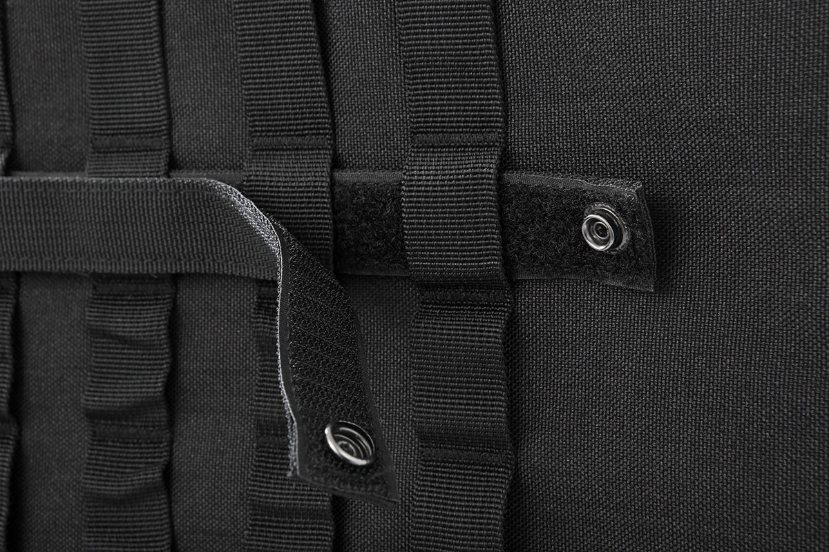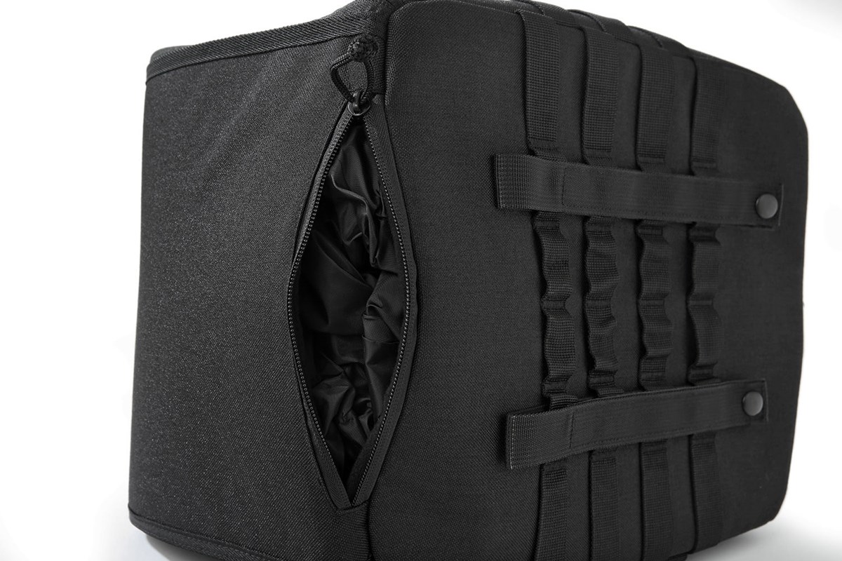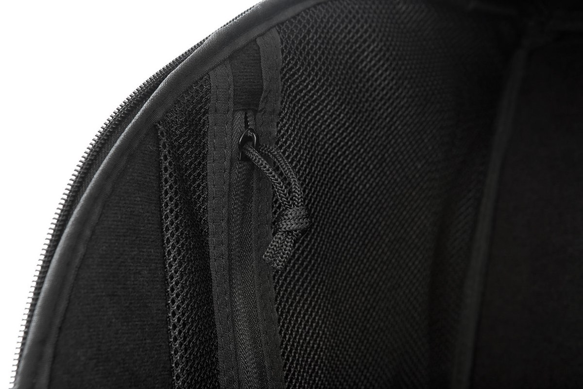 Mit Hilfe zweier Reißverschlüsse lässt sich die Deckellasche nahezu vollständig öffnen, damit Sie den Helm komfortabel verstauen können. Der konturierte Schnitt und die innen eingearbeiteten, einstellbaren und elastischen Haltebänder geben Ihrem Helm zusätzlich sicheren Halt. Zum Schutz sind die beiden Seitenwände, der Boden und die Deckellasche sorgfältig gepolstert. Nach dem Verschließen der Reißverschlüsse wird das Ende der Deckellasche mit einem Klettverschluss und einem einstellbaren Clipverschluss zuverlässig gesichert. Auf den Innenseiten der Seitenwände befindet sich jeweils eine verschließbare Netztasche für Utensilien (z. B. Visierreinigungstücher). Außen an den Seitenwänden können Sie zusätzliche Taschen an den Laschen unseres Wunderlich Haltesystems sicher befestigen. Das gleiche gilt für den Boden der Helmtasche: Den haben wir mit zwei zusätzlichen Klettbändern ausgestattet, die jeweils mit einem Druckknopf gesichert werden. Sie dienen dazu, die Tasche unterwegs, zum Beispiel auf dem Gepäckträger Ihres Motorrads, zu sichern. Der Boden hält ein weiteres, integriertes Fach mit einer Regenhaube bereit.