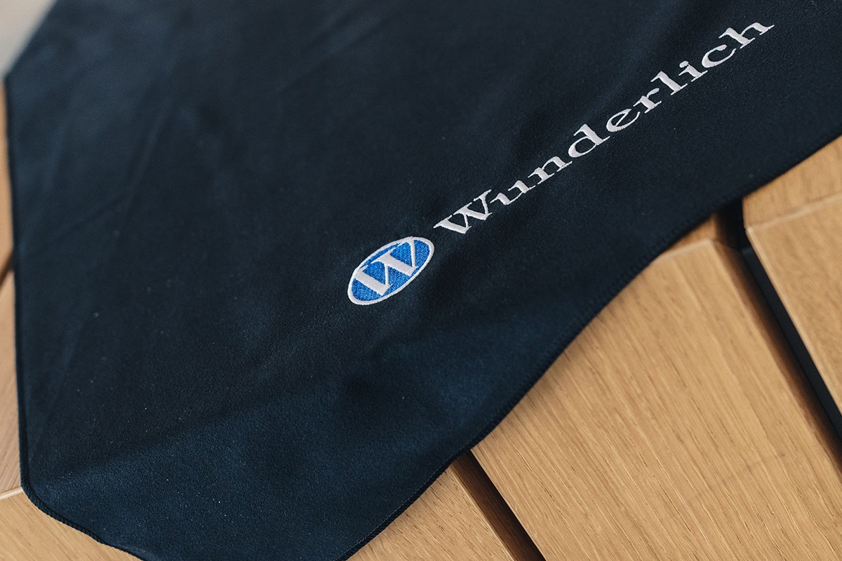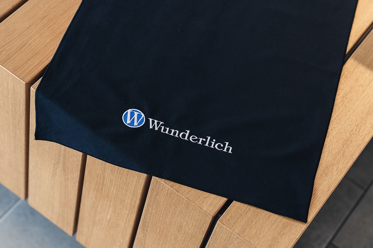 Kompaktes Badetuch aus Microfaser, ideal für unterwegs, denn es braucht wenig Platz und trocknet nach Gebrauch extrem schnell. Hochwertig mit Wunderlich Markenlogo bestickt.