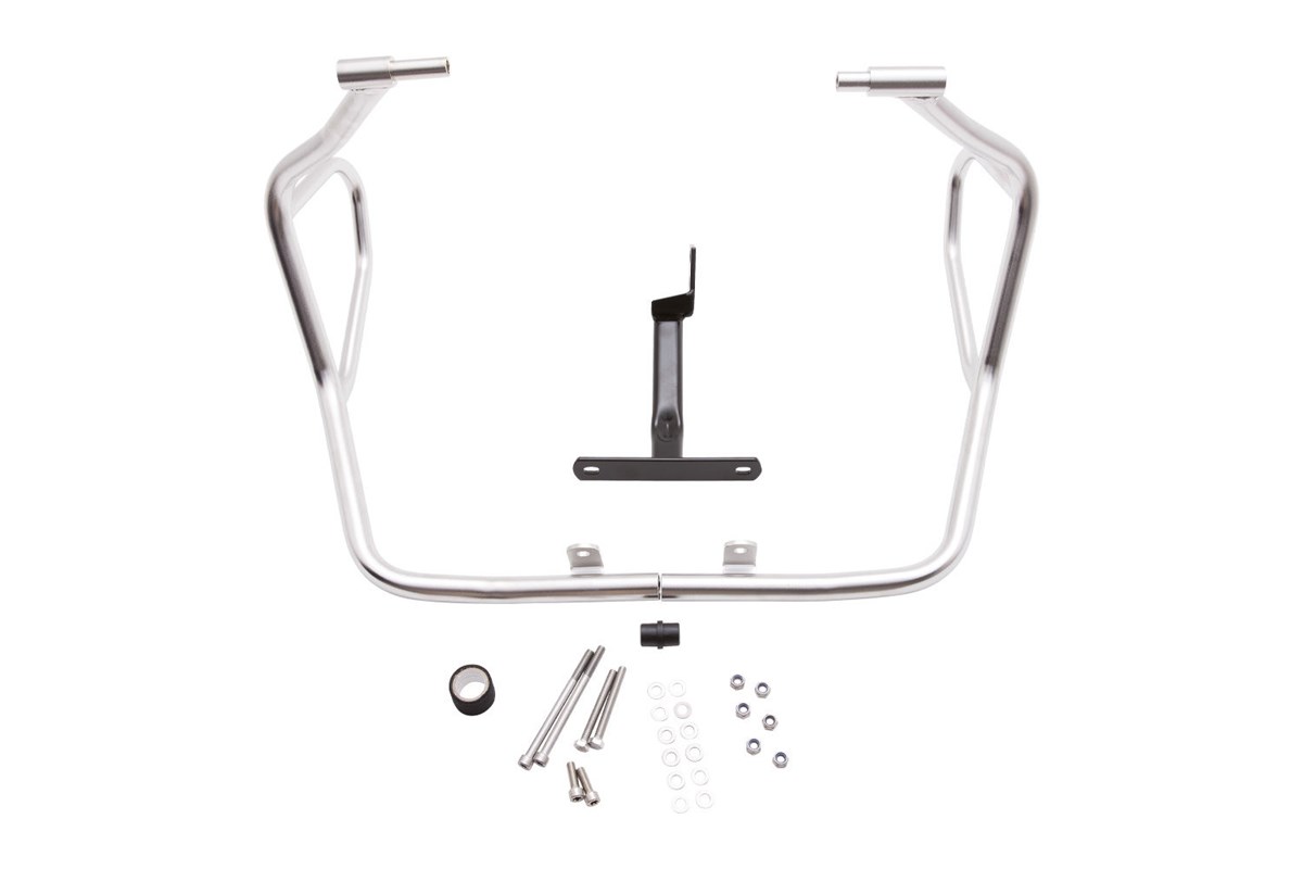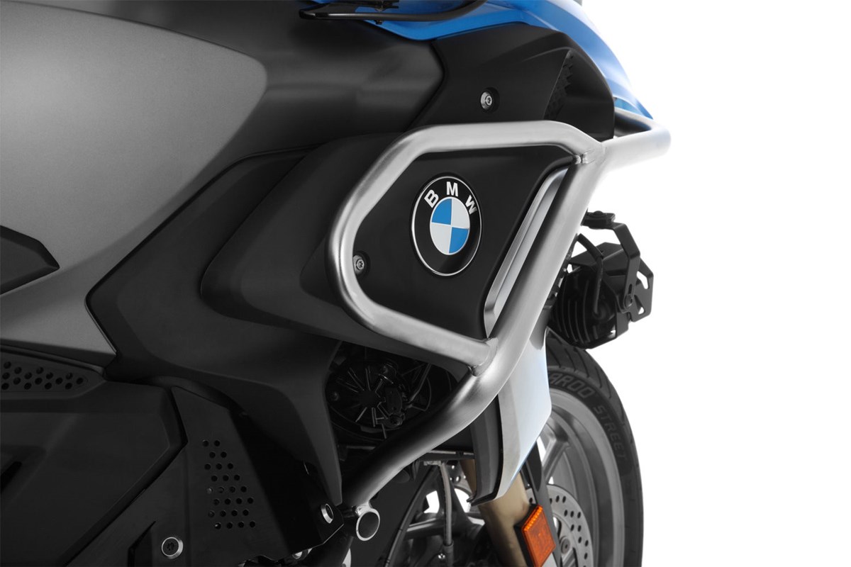 Dieser Tankschutzbügel schützt nicht nur zuverlässig den Tank, sondern auch die Verkleidung, des Vorbaus und die hochgefährdeten Wasserkühler-Einheiten. In Verbindung mit dem Motorschutzbügel bildet er ein durchdachtes Rundumschutzkonzept zur passiven Sicherheit: Im Falle eines Sturzes oder Umfallers werden die wirkenden Kräfte optimal über die Schutzbügelstruktur auf die belastbaren Aufnahmepunkte verteilt, sodass Kraftspitzen vermieden werden. Optisch integriert sich der Schutzbügel sehr gelungen in das Design des Motorrades und unterstreicht das markante Erscheinungsbild. Der Tankschutzbügel ist aus einem Verbund aus 25 und 18 Millimeter Präzisions-Stahlrohr gefertigt. Sie bestehen aus Rohrsegmenten, die modellspezifisch auf CNC-Rohrbiegemaschinen geformt und anschließend sauber verschweißt werden.