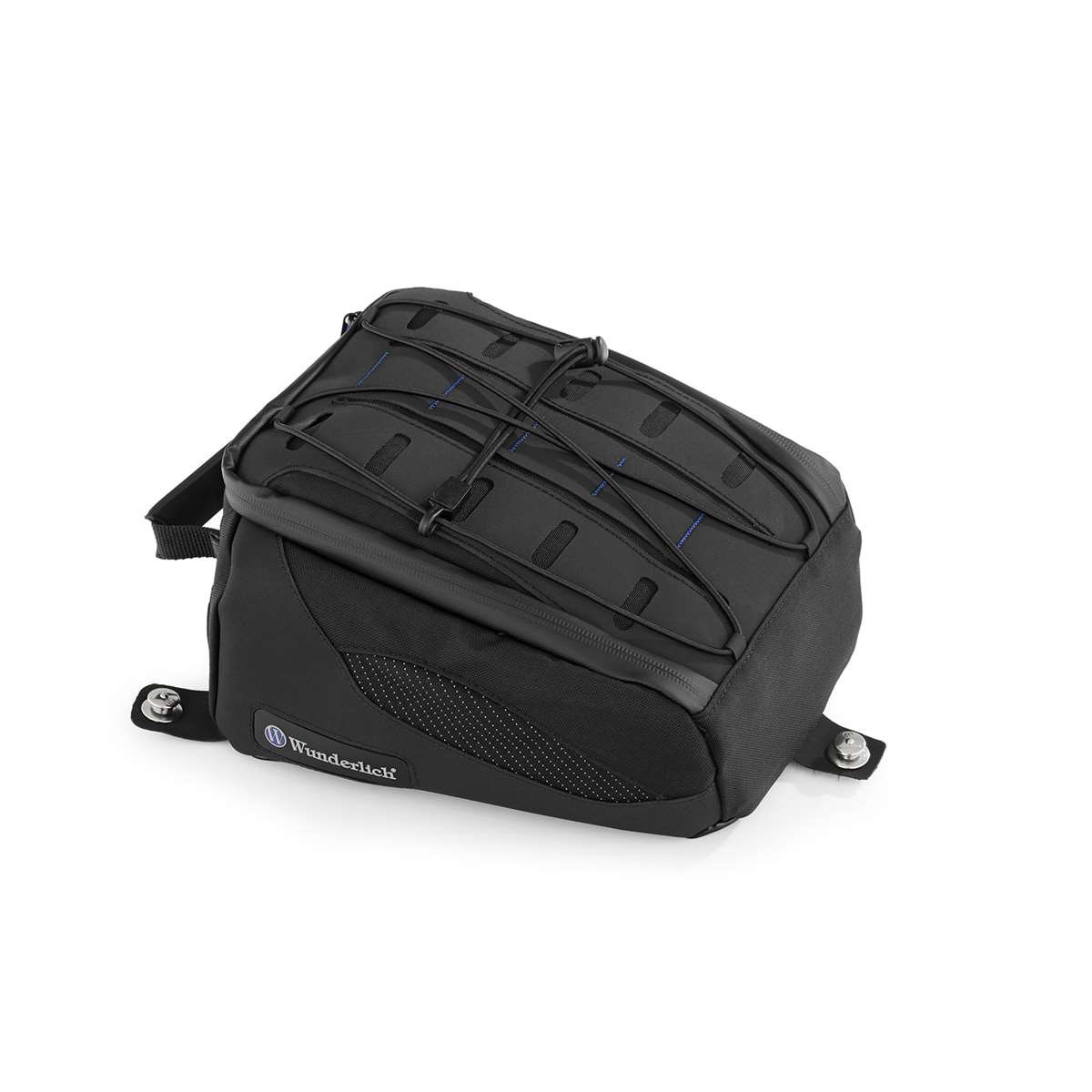 Der Deckel verfügt auf der Oberseite über ein mit dem militärischen MOLLE-System vergleichbares, vielseitig nutzbares Halterungssystem aus regelmäßig angeordneten ovalen Öffnungen. Hier können auf einfache Weise weitere Zubehörtaschen mittels Schlaufen individuell integriert werden. Das einstellbare Netz aus einem elastischen, im Zickzack angeordneten Gummizug dient zur schnellen Aufnahme von Handschuhen etc. Zum einfachen Mitnehmen haben wir einen griffigen, bequemen Tragegriff vorgesehen.