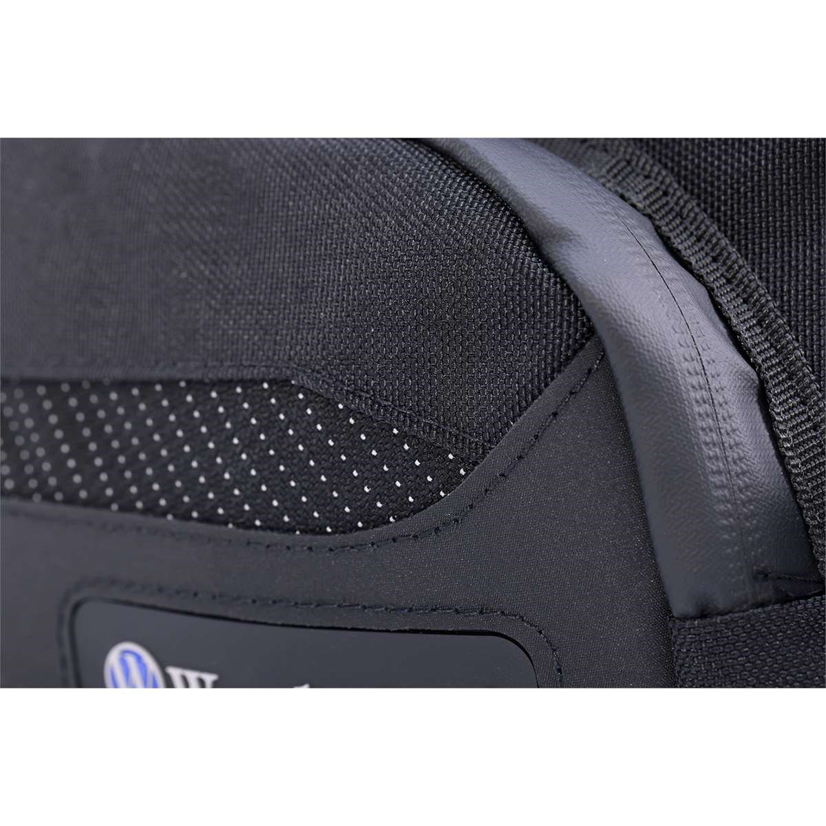 Der Deckel verfügt auf der Oberseite über ein mit dem militärischen MOLLE-System vergleichbares, vielseitig nutzbares Halterungssystem aus regelmäßig angeordneten ovalen Öffnungen. Hier können auf einfache Weise weitere Zubehörtaschen mittels Schlaufen individuell integriert werden. Das einstellbare Netz aus einem elastischen, im Zickzack angeordneten Gummizug dient zur schnellen Aufnahme von Handschuhen etc. Zum einfachen Mitnehmen haben wir einen ergonomischen Tragegriff vorgesehen.