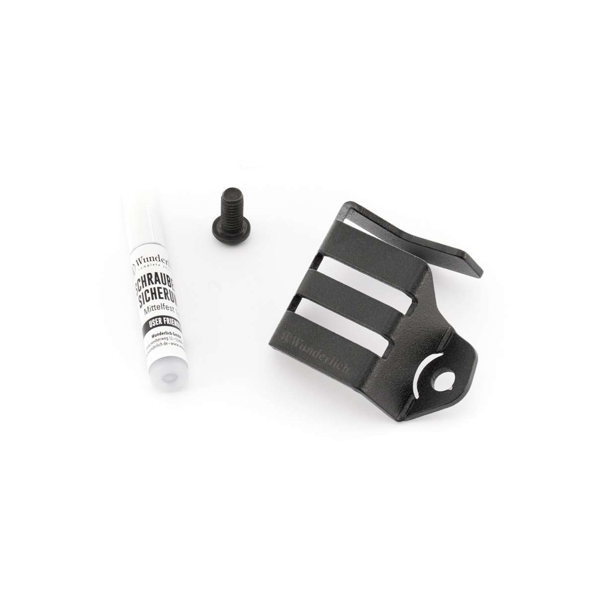 Das dezent integrierte Schutzcover bewahrt den Bremsflüssigkeitsbehälter der Hinterradbremse vor mechanischen Beschädigungen und reduziert die Gefahr, die beispielsweise bei einem Sturz droht oder wenn man im Gelände hängenbleibt. Auch eine Unachtsamkeit beim Aufsteigen kann ausreichen, um den Behälter, der lediglich mit einer Schraube fixiert ist, zu beschädigen oder gar abzureißen. Schlimmer als ein offensichtlicher Schaden ist jedoch eine unbemerkte Beschädigung, die zum Bremsflüssigkeitsverlust und im schlimmsten Fall zum unerwarteten Ausfall der Bremse führen kann. Auch davor schützt unser solides Cover, das wir aus 2 mm starkem Aluminiumblech herstellen und das den Behälter rundum schützt. Die kompakte, dreidimensional gekantete Konstruktion erhöht die Bauteilsteifigkeit und Widerstandsfähigkeit zusätzlich. Die schräg verlaufenden Aussparungen dienen nicht ausschließlich dem dynamischen Design des Covers, ihnen ist gleichzeitig eine Funktion zugedacht. So lässt sich nämlich trotz des montierten Schutzcovers der Bremsflüssigkeitsstand einfach ablesen. Der obere Abschluss des Covers reduziert die Gefahr ungewollter Manipulationen an der Bremsanlage, denn das Abschrauben des Behälterdeckels wird erschwert. Mit Wunderlich Markenlogo.