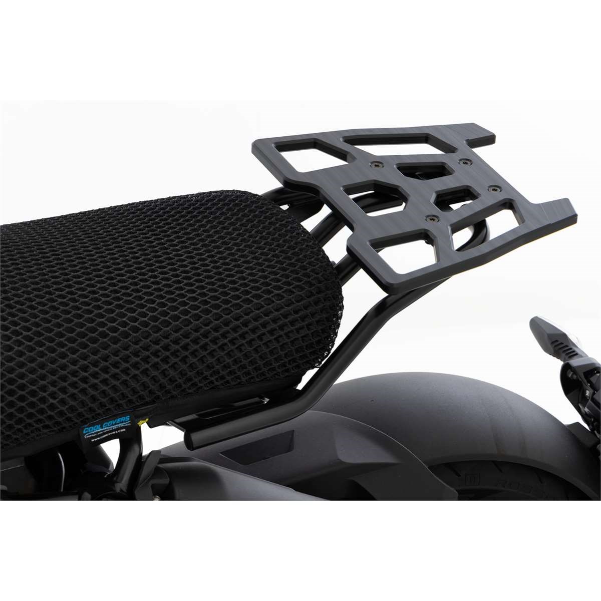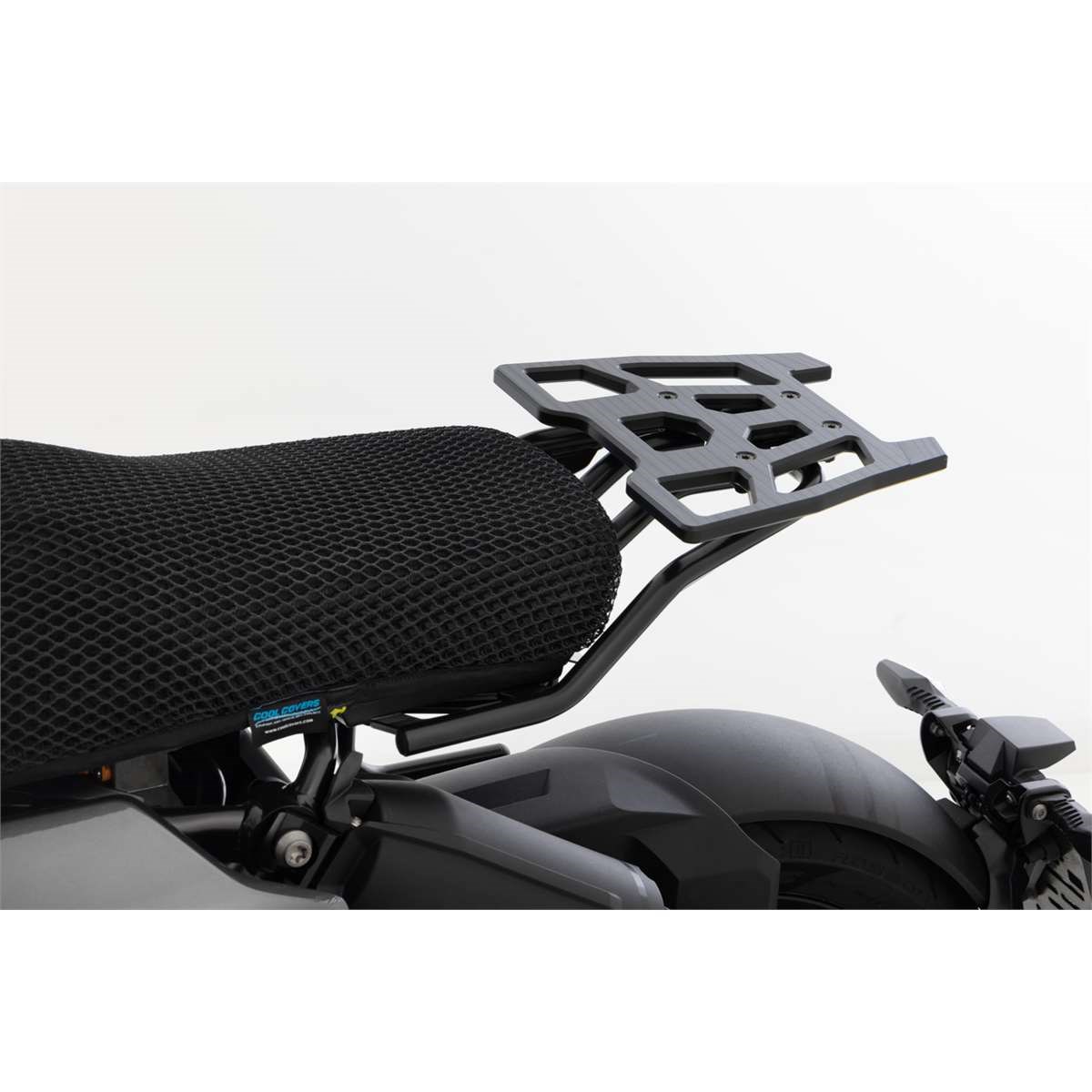 Tja, wer fährt schon gerne allein mit seinem Topcase spazieren? Unsere Entwickler auf jeden Fall nicht! Im Gegensatz zum serienmäßigen Topcaseträger des BMW CE 04 Scooters haben wir unseren Träger für das originale Topcase nicht auf, sondern hinter dem Soziussitz angeordnet. So bleibt der Soziussitz für die Fahrt zu zweit stets frei! Der aufwändig aus Präzisionsstahlrohren gefertigte, solide Träger folgt dabei gekonnt unauffällig der aufwärts strebenden Linie des Beifahrersitzes und fügt sich so perfekt ins avantgardistische Design des E-Scooters ein. Er wird am Heck des E-Scooters an vorhandenen Rahmenpunkten verschraubt.