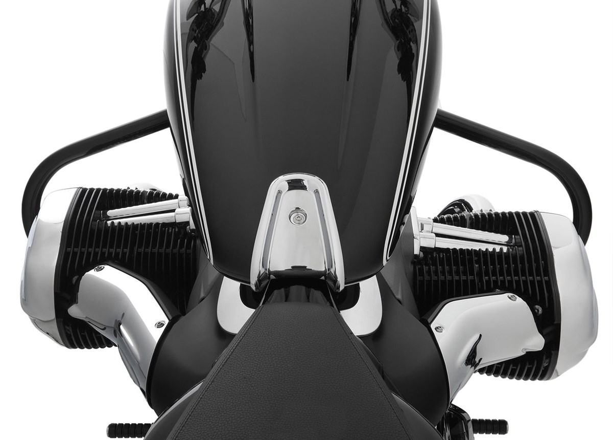 Der erste Schutzbügel aus 32er Rohr! Wir haben uns aus zweierlei Gründen für diese Rohrdimension entschieden: Aus Festigkeitsgründen, um die R 18 optimal zu schützen und aus ästhetischen Gründen. Denn nur das 32er Rohr wirkt an der imposanten R 18 -und im Umfeld der mächtigen Krümmer Rohre- ausgewogen und ästhetisch. Darüber hinaus haben wir uns bewusst für eine geschlossene, einteilige Form des Schutzbügels entschieden, die, neben der Dimensionierung, zusätzliche konstruktive Steifigkeit beiträgt. So fügt sich der hochwertig pulverbeschichtete und mit Klarlack veredelte Schutzbügel - perfekt zum Rahmen passend - dezent in die Gesamtstilistik der R 18 ein und setzt dennoch einen abgestimmten eigenen Akzent. Die Pik-förmige Gestalt erinnert nicht von ungefähr an die Schutzbügel der klassischen luftgekühlten BMW-Boxer.