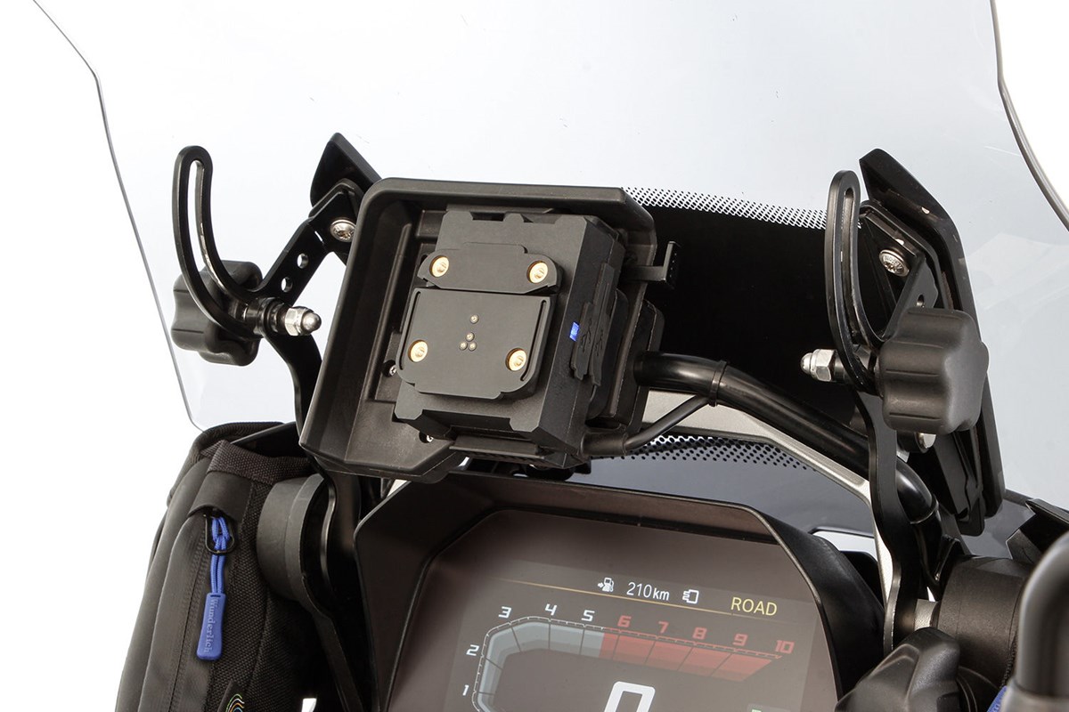 Auf der frontseitigen Aufnahme des Navigationsadapters können Navigationsgeräte wie beispielsweise ein TomTom Rider oder das Garmin XT und XT2 direkt montiert werden. Die Spannungsversorgung erfolgt Plug & Play über die angebrachten Kontakte. Somit sparen Sie sich das Verlegen und Anschließen einer extra Stromversorgung. Ist das Navi einmal montiert, so ist dieses mit der Halterung diebstahlsicher verbunden.