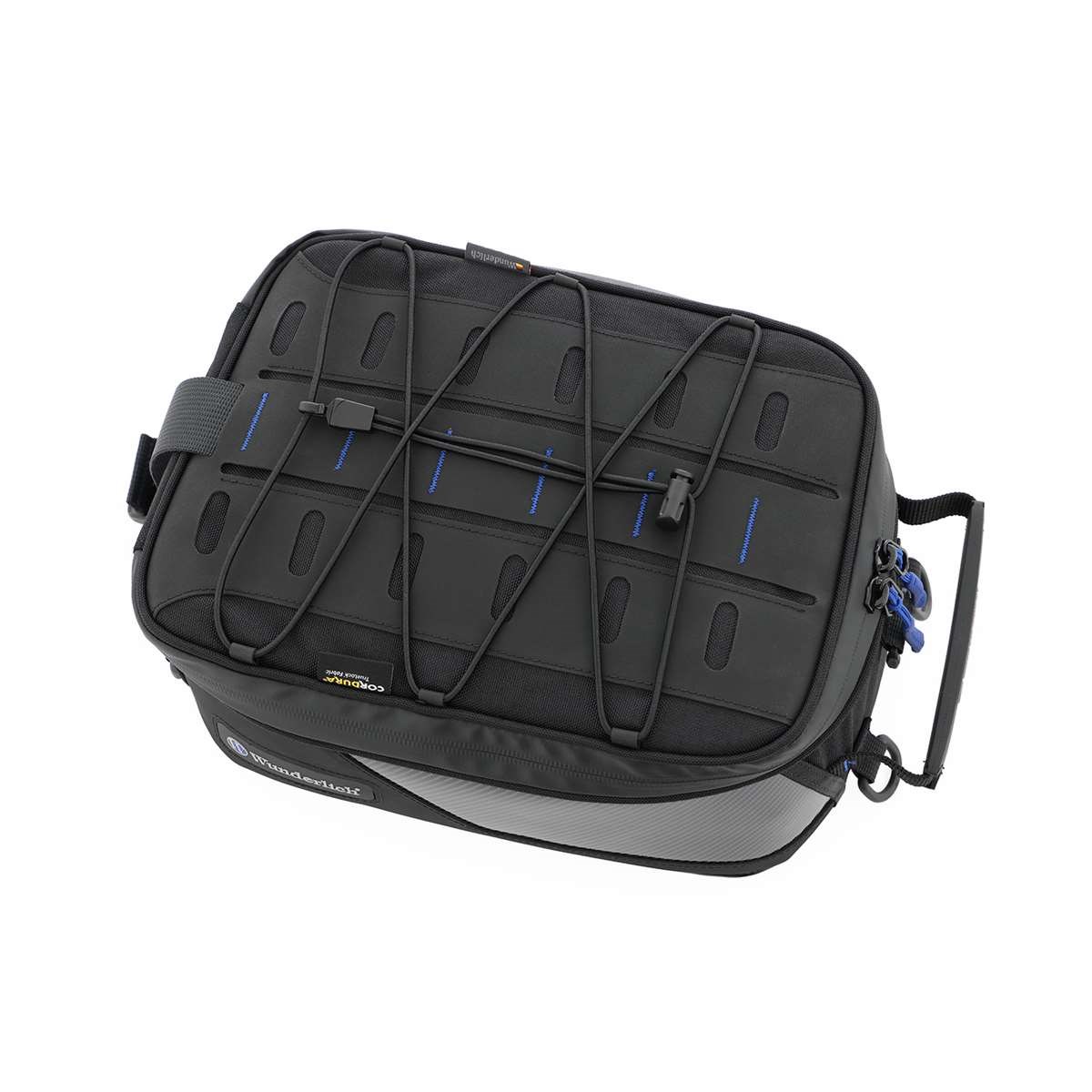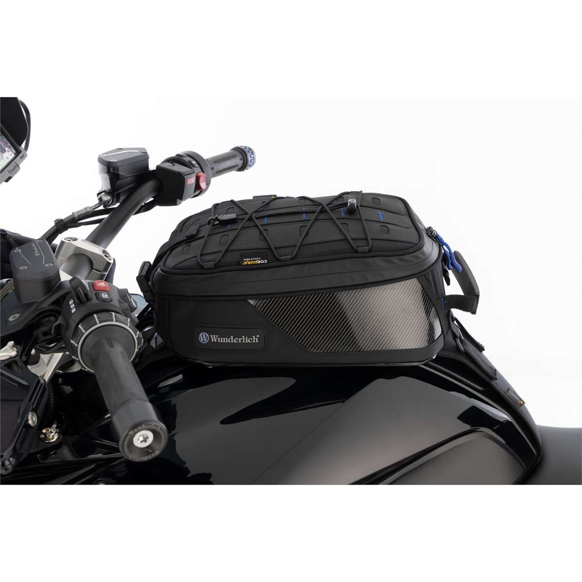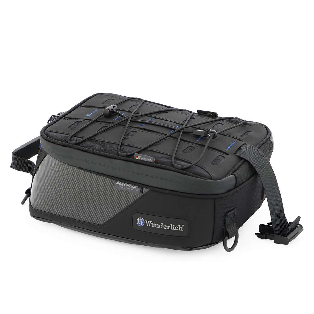 Dieser ELEPHANT TOUR glänzt als kompakter, hochwertiger Tankrucksack für den alltäglichen Einsatz. Das Highlight sind die beiden großzügigen Applikationen aus echtem Carbon an den Flanken rechts und links, die den sportiven, innovativen, technischen Look unterstreichen. Er überzeugt mit nachhaltigen Geweben und Herstellungsverfahren sowie weiter optimierter Funktionalität und Variabilität. Das Hauptfach des aus CORDURA® TrueLock™ gefertigten Tankrucksacks fasst ein Volumen von 10 Litern. Die formstabilisierende Einlage schützt den Inhalt zuverlässig und vermeidet jegliches Ausbeulen oder Flattern bei hohen Geschwindigkeiten. Unser hauseigenes, blaues Futter sorgt für Übersichtlichkeit. Der ELEPHANT bietet ein, dem militärischen Molle-System vergleichbares, Haltesystem und nimmt bei Bedarf zusätzliche Taschen - wie unsere Aufsatztaschen - auf. Es wird durch ein praktisches, elastisches Gepäcknetz ergänzt. Wie üblich sind die Reißverschlüsse wasserabweisend ausgeführt und mit ergonomisch geformten, griffgünstigen Zippern versehen. Auf die wasserabweisende Kabeldurchführung für eine elektrische Versorgung oder das Smartphone Ladekabel muss man genauso wenig verzichten, wie auf das Tragegeschirr, dass den Tankrucksack jenseits des Motorrads zur Umhängetasche verwandelt.